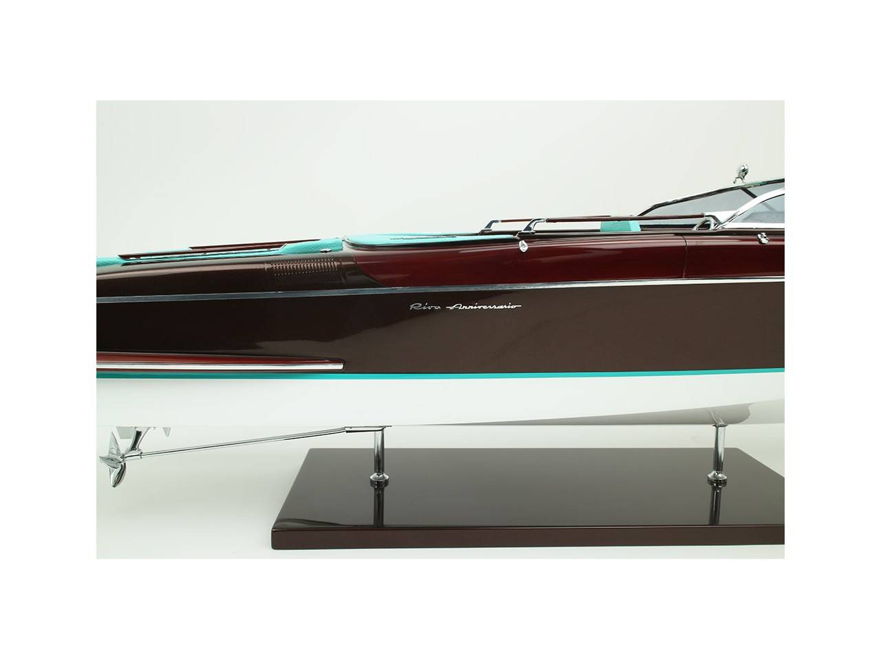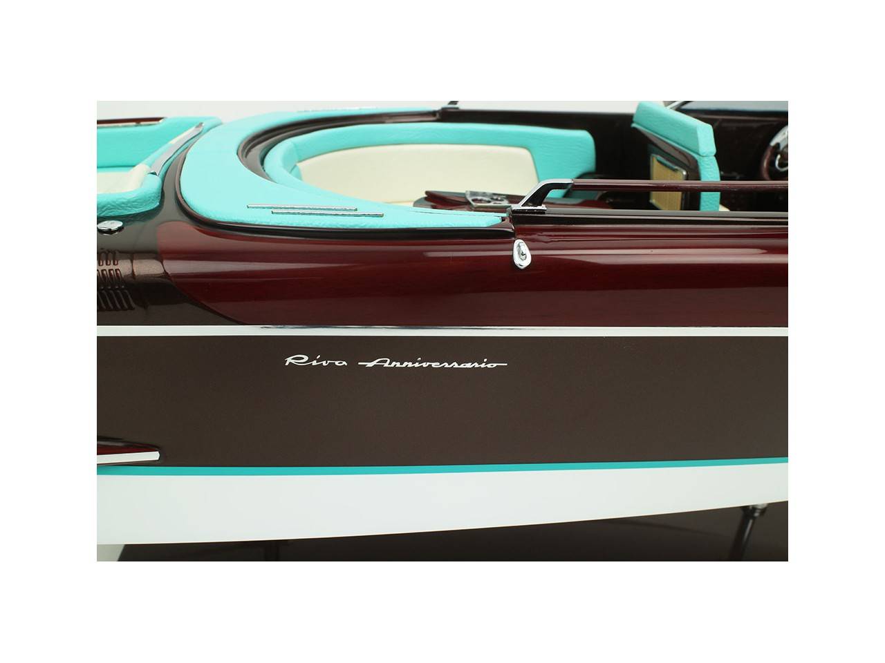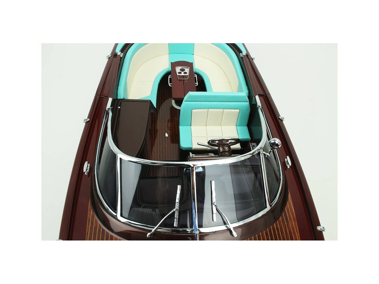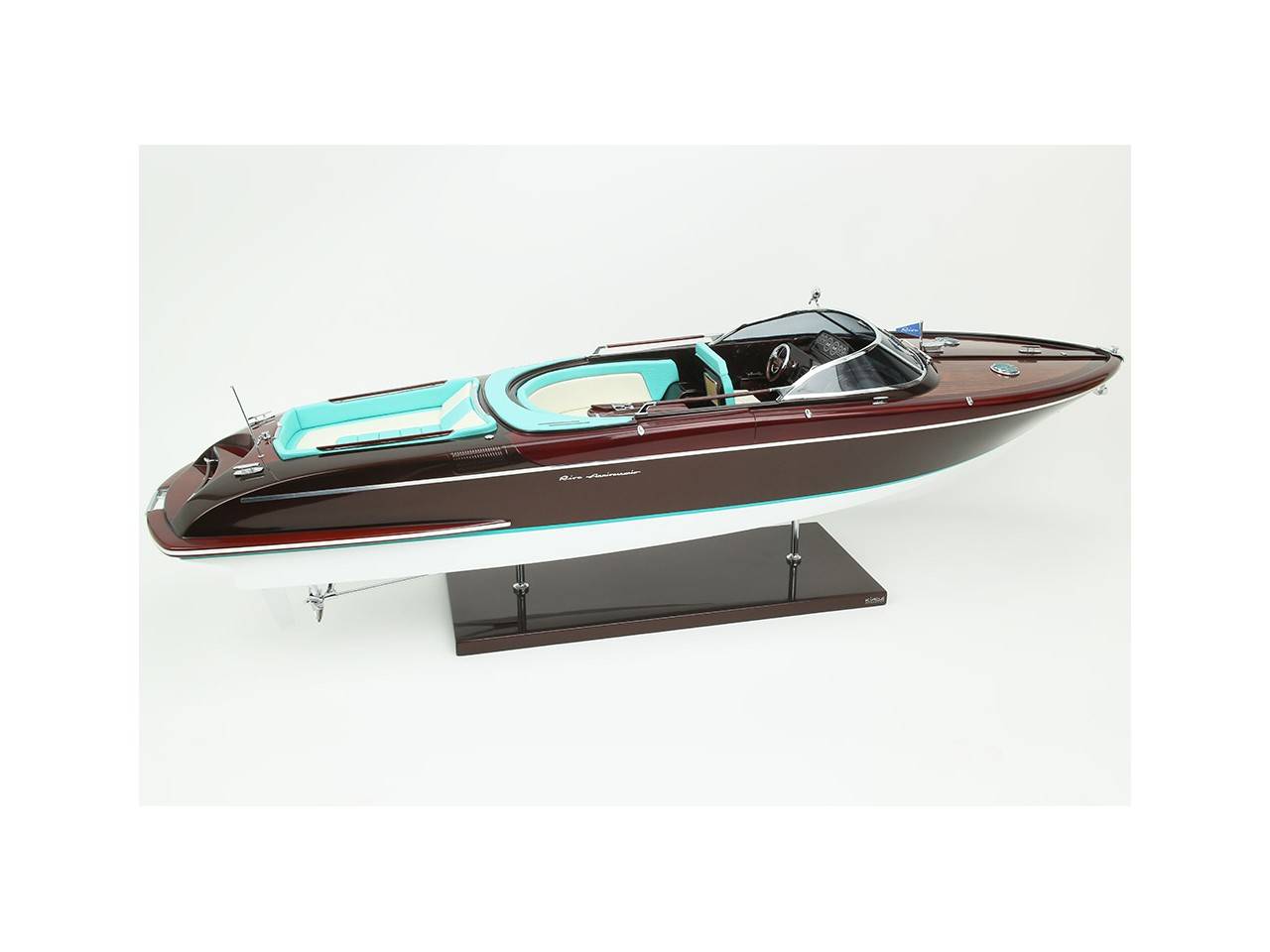 Cette série limitée de 180 pièces du Riva Anniversario, d’une longueur de 84 cm a été réalisée à l’échelle 1/12ème. Fidèle réplique, cette maquette officielle et exclusive est entièrement réalisée à la main. La coque a été réalisée d’après les plans d’origine en fibre de verre et polyester. Toutes les pièces d’accastillage sont en laiton chromé réalisées sur mesure par par des bijoutiers. Une véritable sellerie marine est utilisée pour la confection des sièges et du bain de soleil. 10 couches de vernis sont appliquées sur le pont pour obtenir une excellente brillance et profondeur de vernis. Une peinture métallisée est appliquée sur la coque.