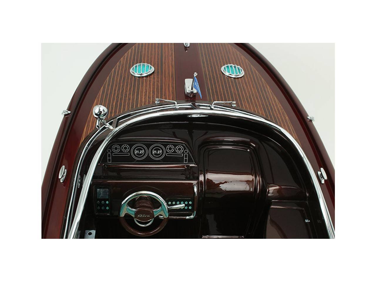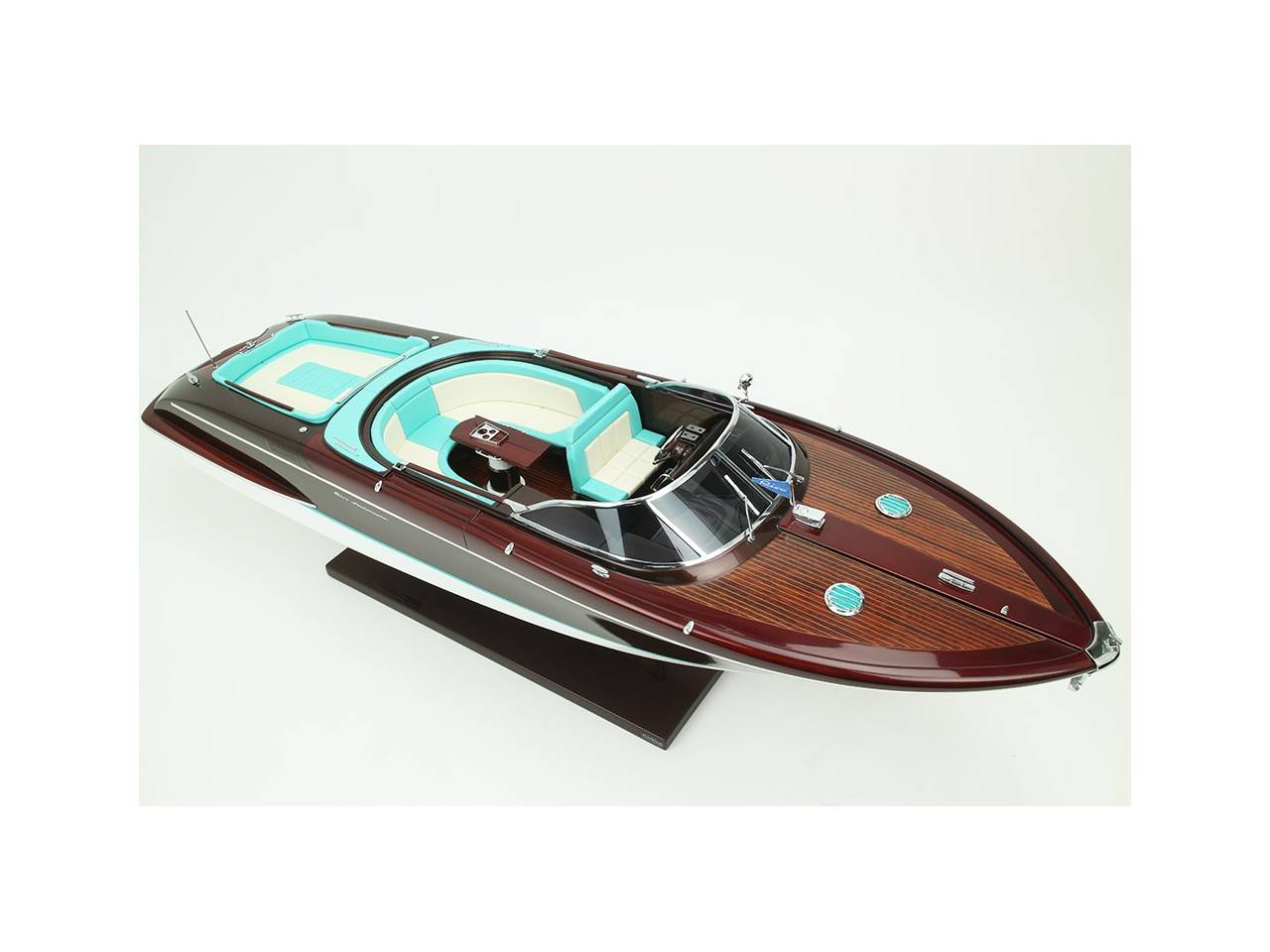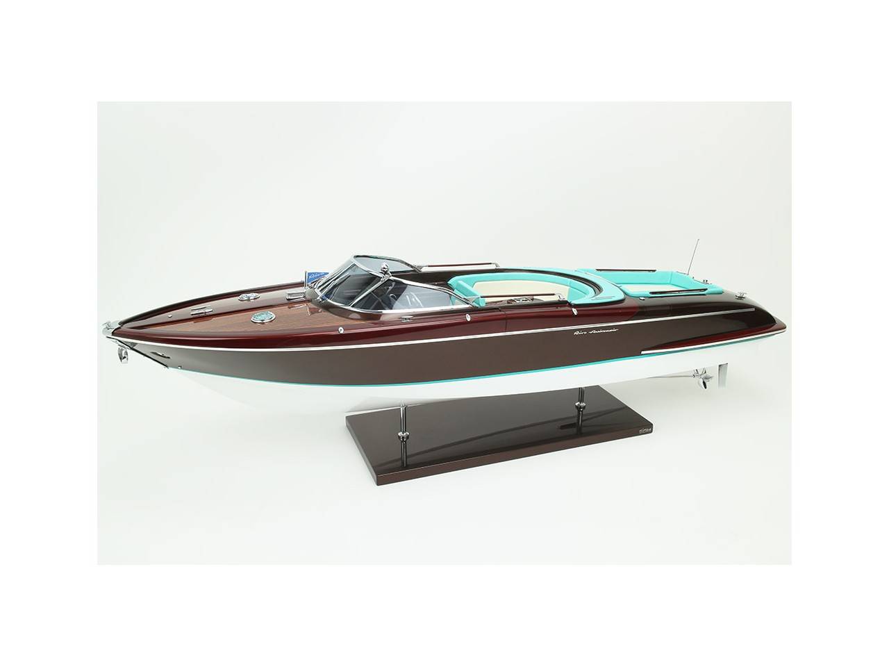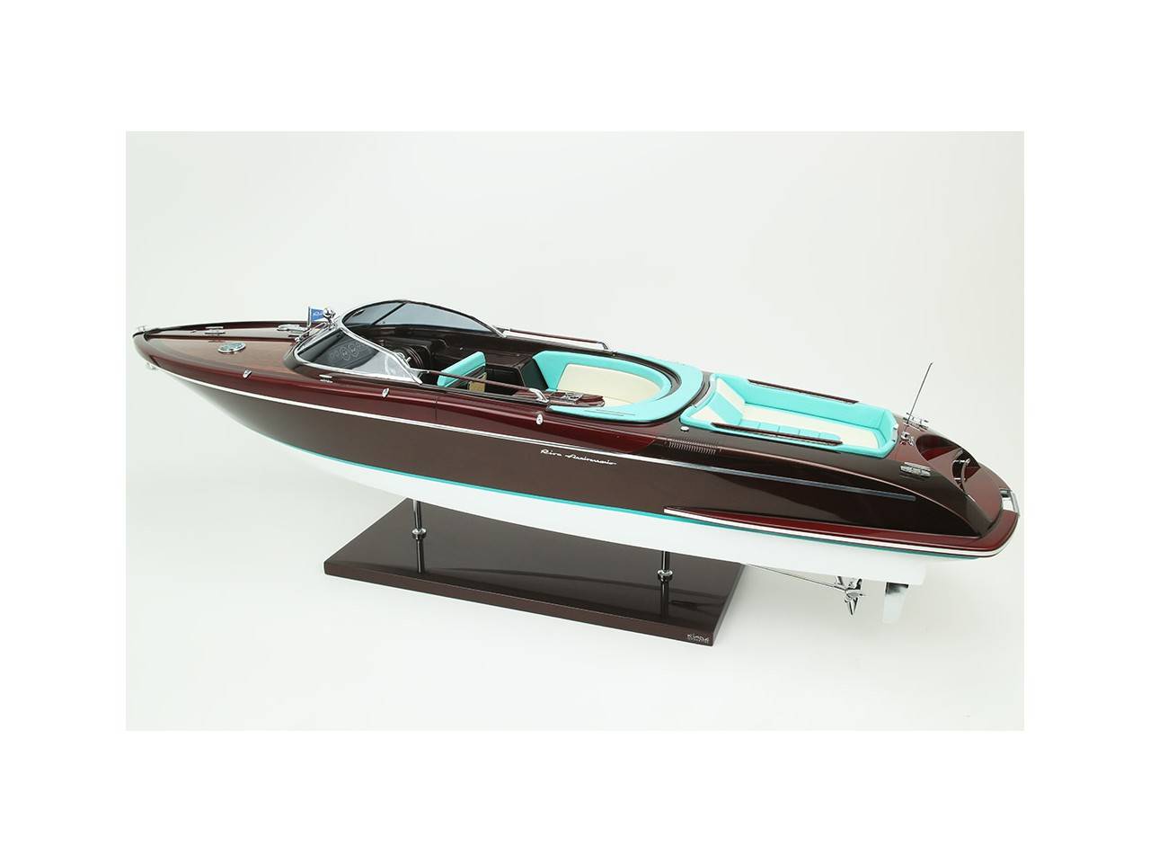 Cette série limitée de 180 pièces du Riva Anniversario, d’une longueur de 84 cm a été réalisée à l’échelle 1/12ème. Fidèle réplique, cette maquette officielle et exclusive est entièrement réalisée à la main. La coque a été réalisée d’après les plans d’origine en fibre de verre et polyester. Toutes les pièces d’accastillage sont en laiton chromé réalisées sur mesure par par des bijoutiers. Une véritable sellerie marine est utilisée pour la confection des sièges et du bain de soleil. 10 couches de vernis sont appliquées sur le pont pour obtenir une excellente brillance et profondeur de vernis. Une peinture métallisée est appliquée sur la coque.