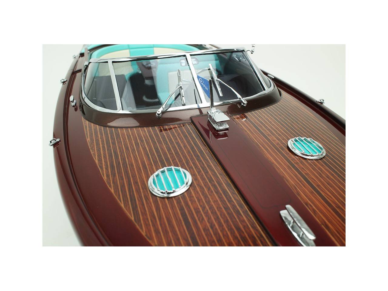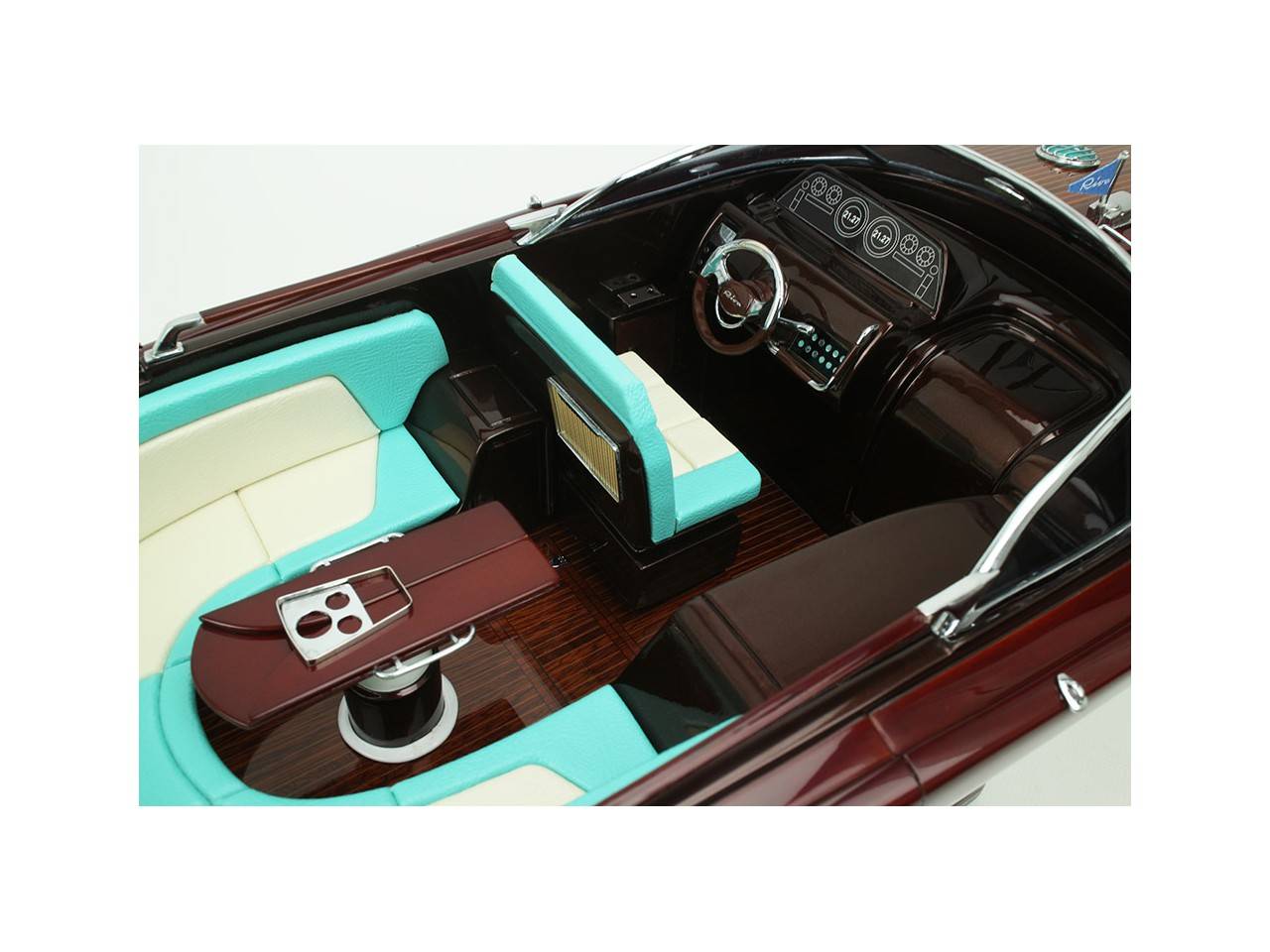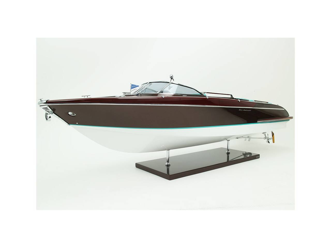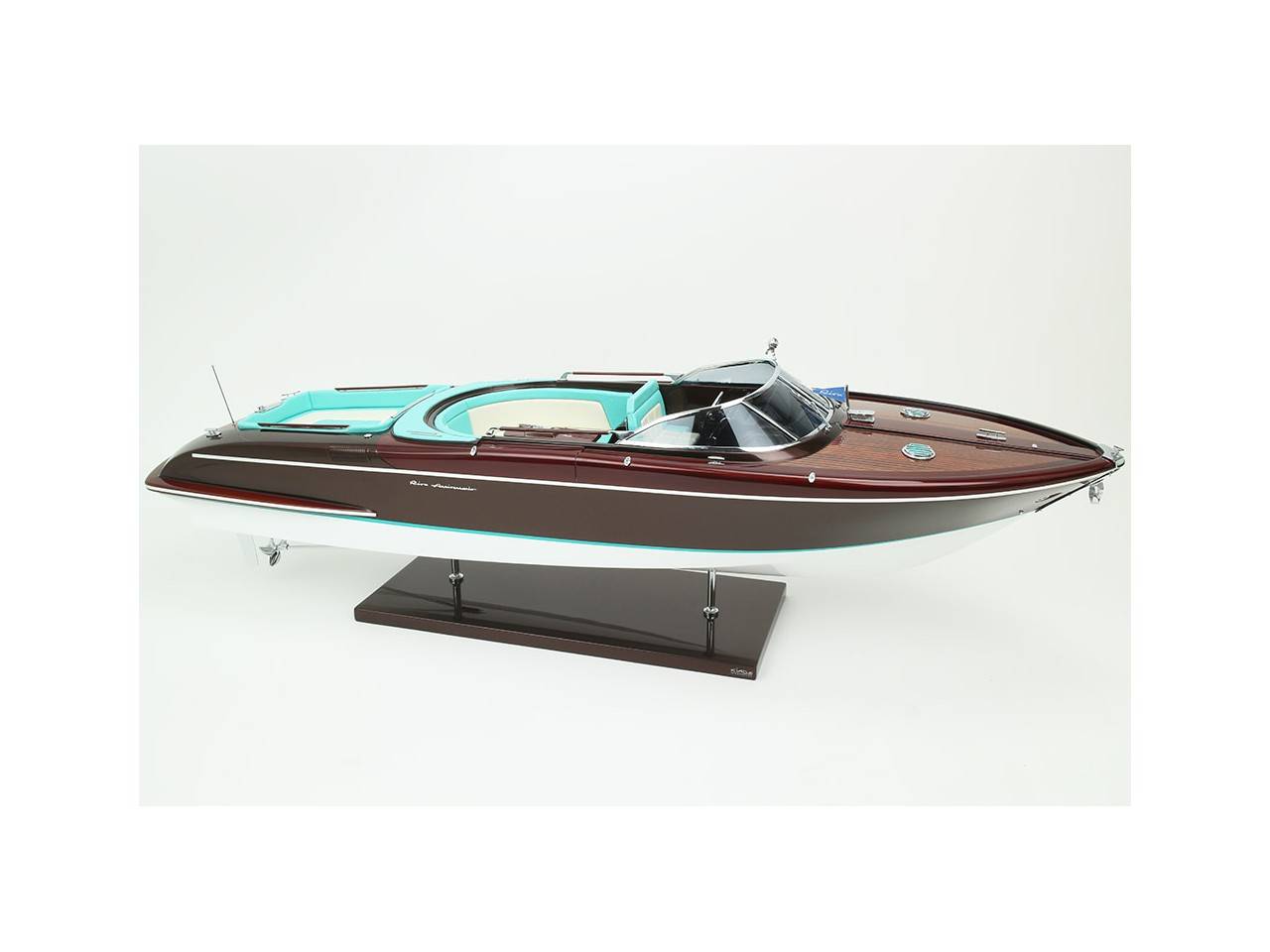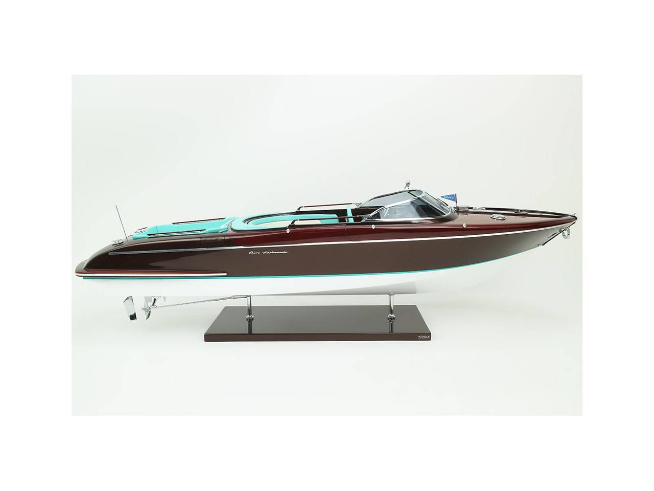 Cette série limitée de 180 pièces du Riva Anniversario, d’une longueur de 84 cm a été réalisée à l’échelle 1/12ème. Fidèle réplique, cette maquette officielle et exclusive est entièrement réalisée à la main. La coque a été réalisée d’après les plans d’origine en fibre de verre et polyester. Toutes les pièces d’accastillage sont en laiton chromé réalisées sur mesure par par des bijoutiers. Une véritable sellerie marine est utilisée pour la confection des sièges et du bain de soleil. 10 couches de vernis sont appliquées sur le pont pour obtenir une excellente brillance et profondeur de vernis. Une peinture métallisée est appliquée sur la coque.