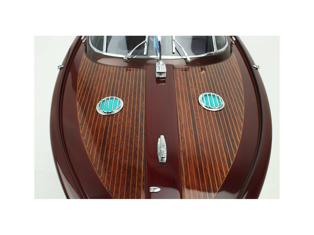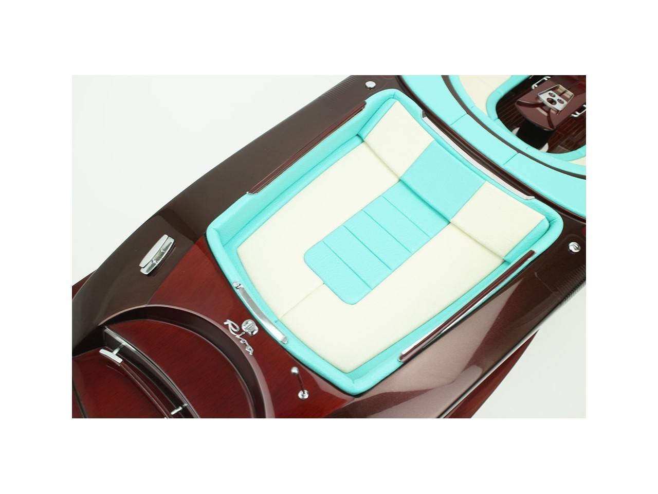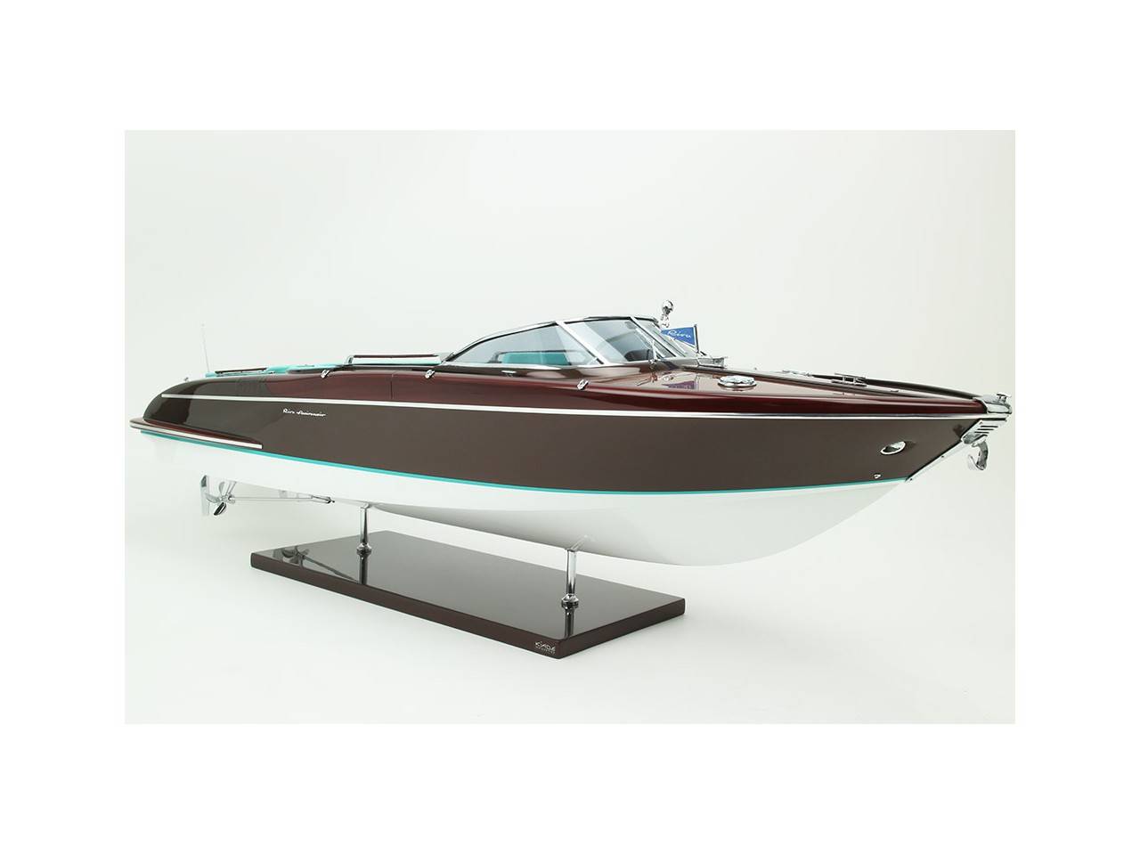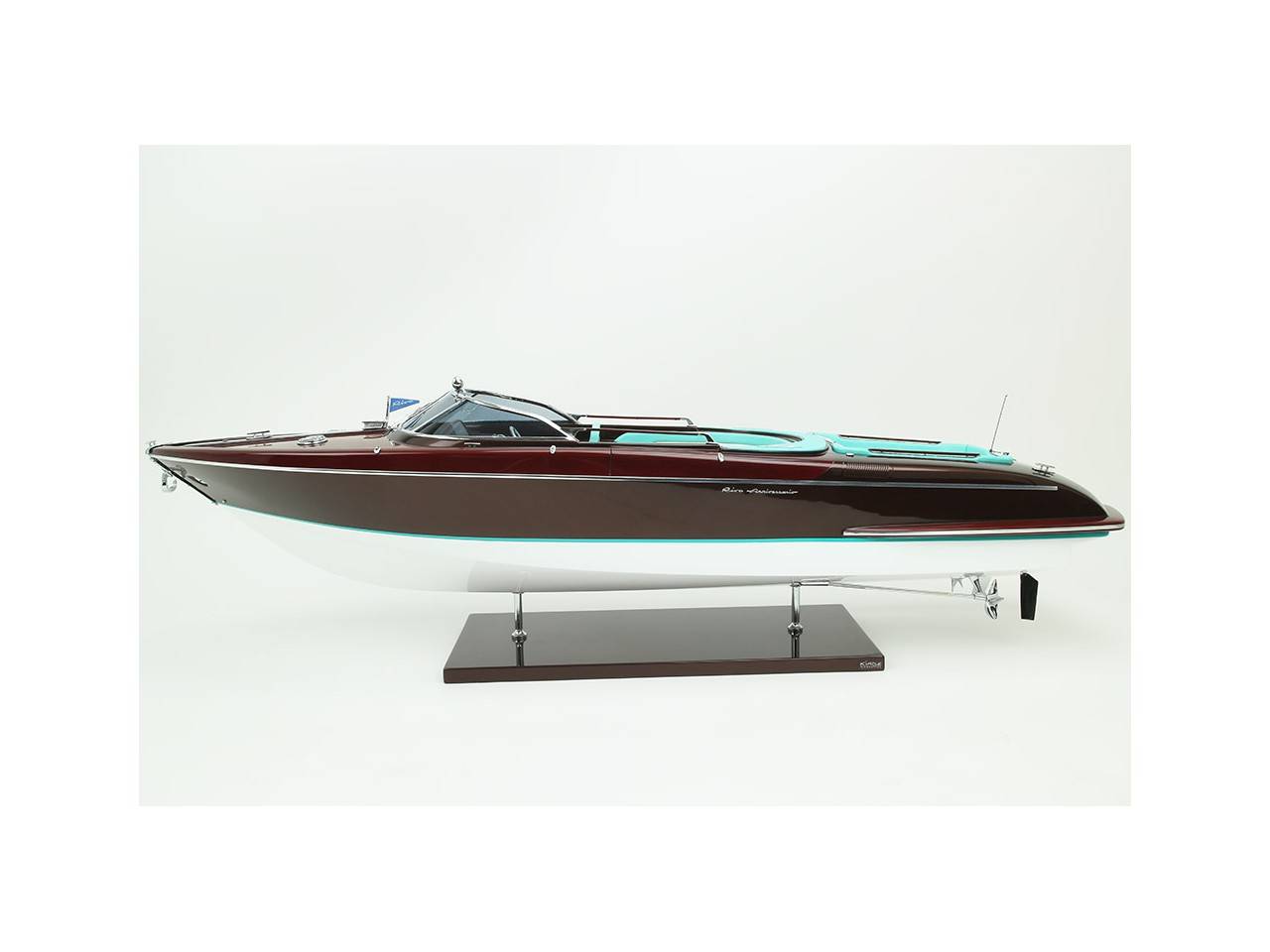 Cette série limitée de 180 pièces du Riva Anniversario, d’une longueur de 84 cm a été réalisée à l’échelle 1/12ème. Fidèle réplique, cette maquette officielle et exclusive est entièrement réalisée à la main. La coque a été réalisée d’après les plans d’origine en fibre de verre et polyester. Toutes les pièces d’accastillage sont en laiton chromé réalisées sur mesure par par des bijoutiers. Une véritable sellerie marine est utilisée pour la confection des sièges et du bain de soleil. 10 couches de vernis sont appliquées sur le pont pour obtenir une excellente brillance et profondeur de vernis. Une peinture métallisée est appliquée sur la coque.
