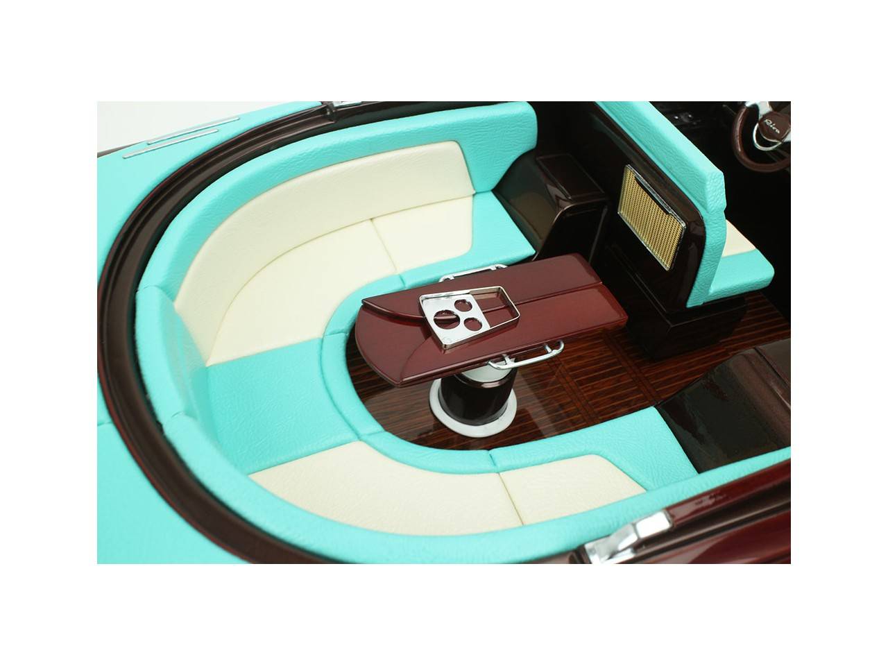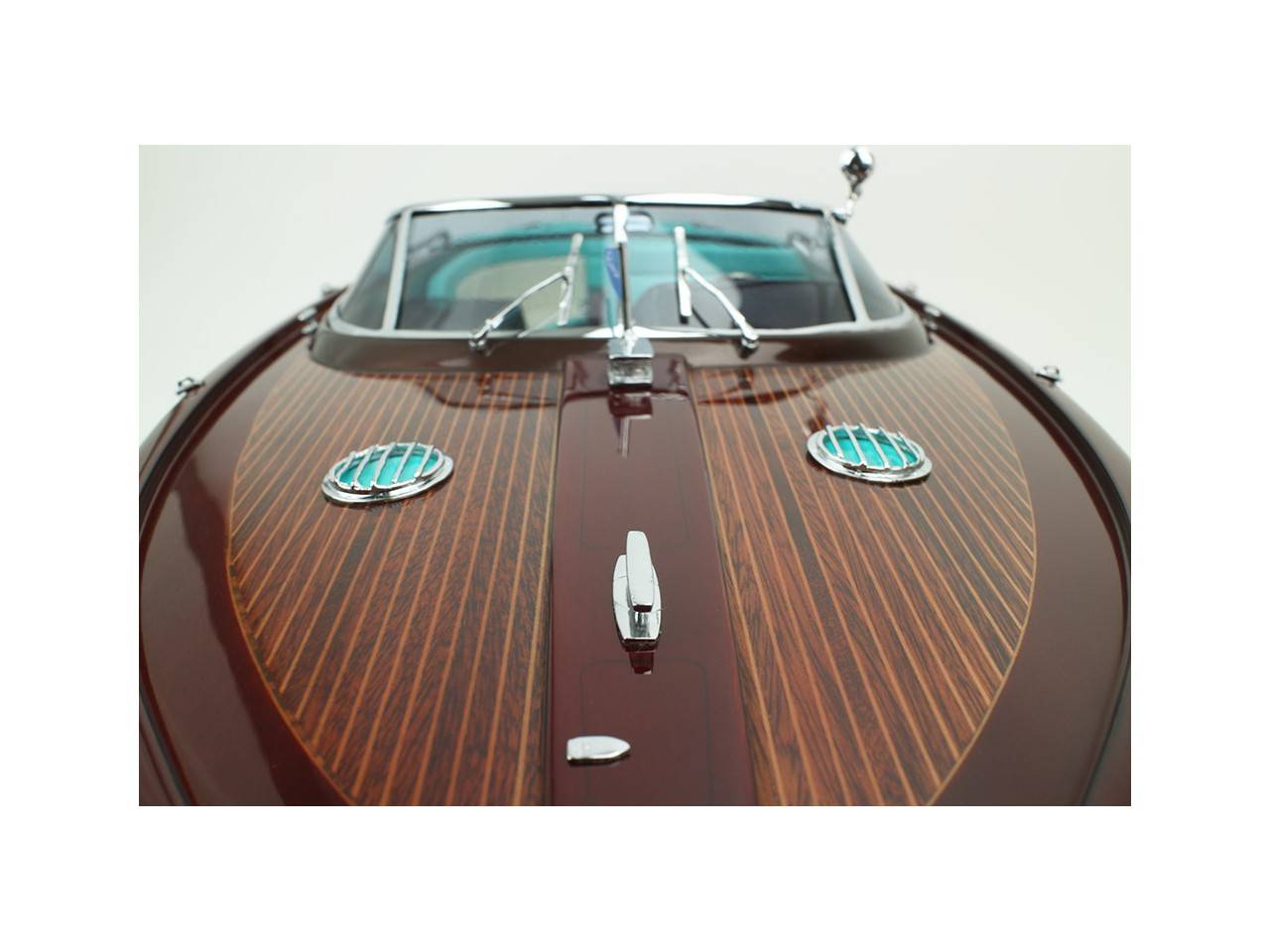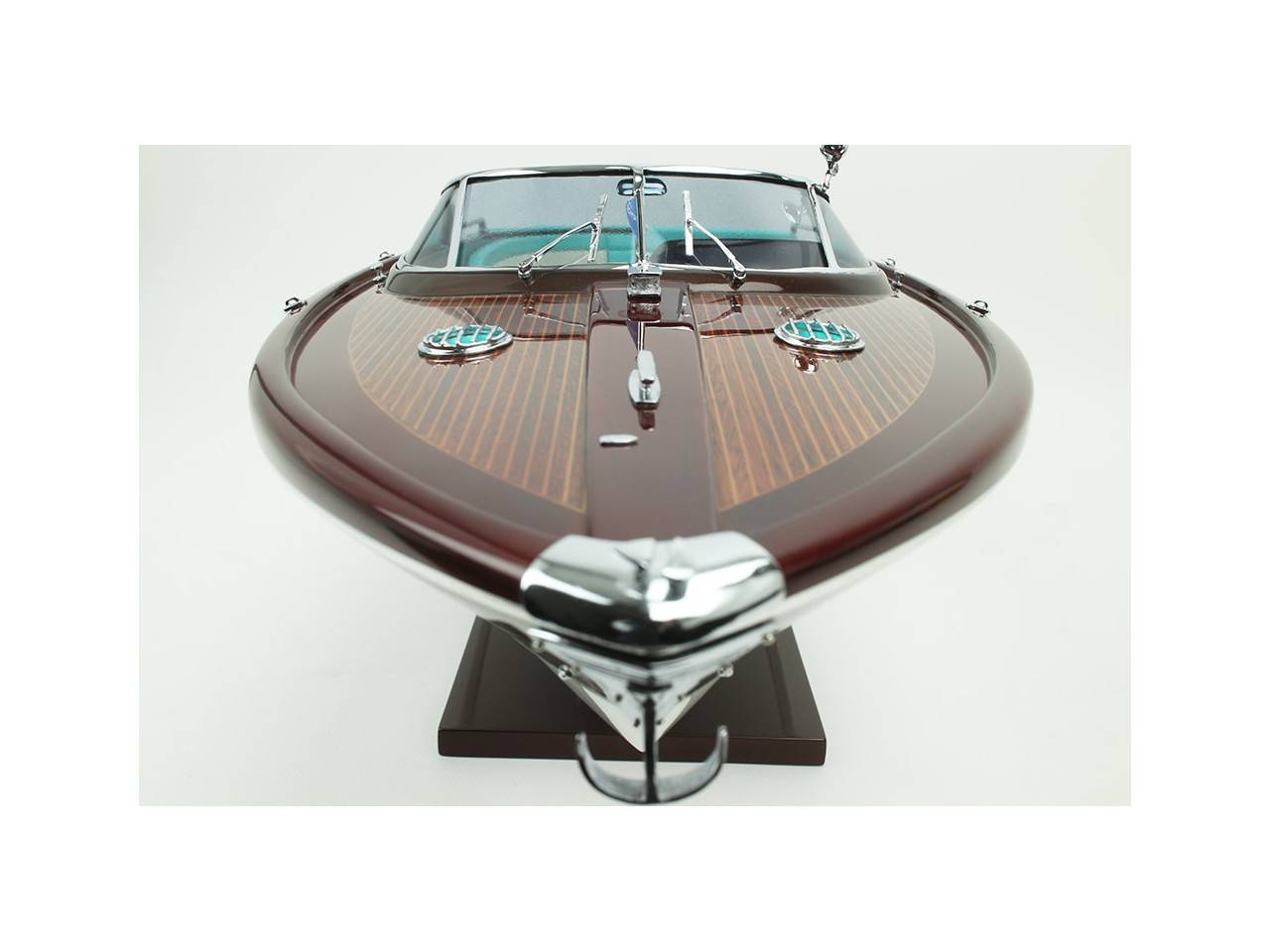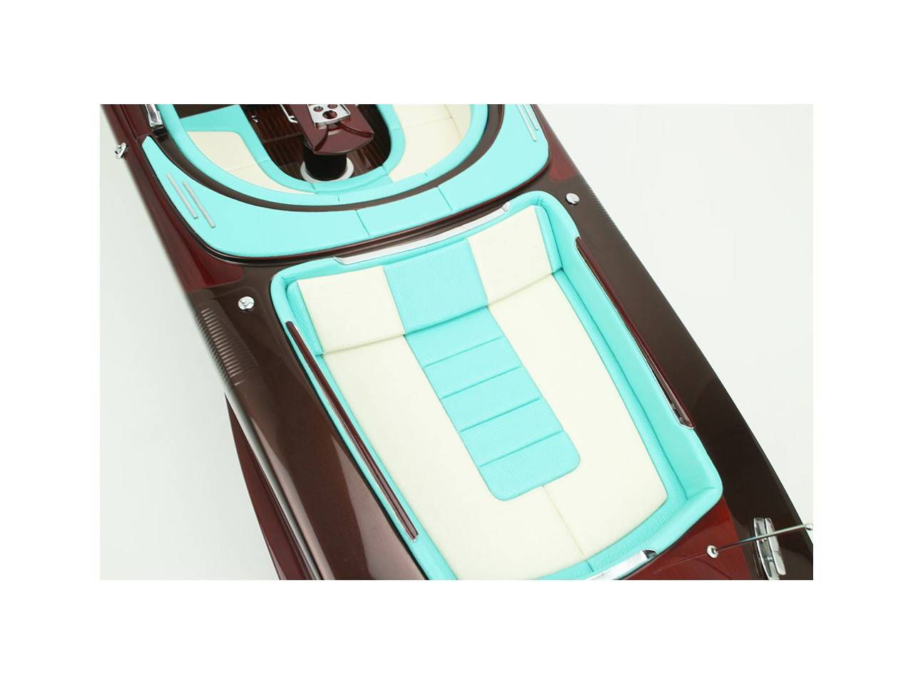 Cette série limitée de 180 pièces du Riva Anniversario, d’une longueur de 84 cm a été réalisée à l’échelle 1/12ème. Fidèle réplique, cette maquette officielle et exclusive est entièrement réalisée à la main. La coque a été réalisée d’après les plans d’origine en fibre de verre et polyester. Toutes les pièces d’accastillage sont en laiton chromé réalisées sur mesure par par des bijoutiers. Une véritable sellerie marine est utilisée pour la confection des sièges et du bain de soleil. 10 couches de vernis sont appliquées sur le pont pour obtenir une excellente brillance et profondeur de vernis. Une peinture métallisée est appliquée sur la coque.