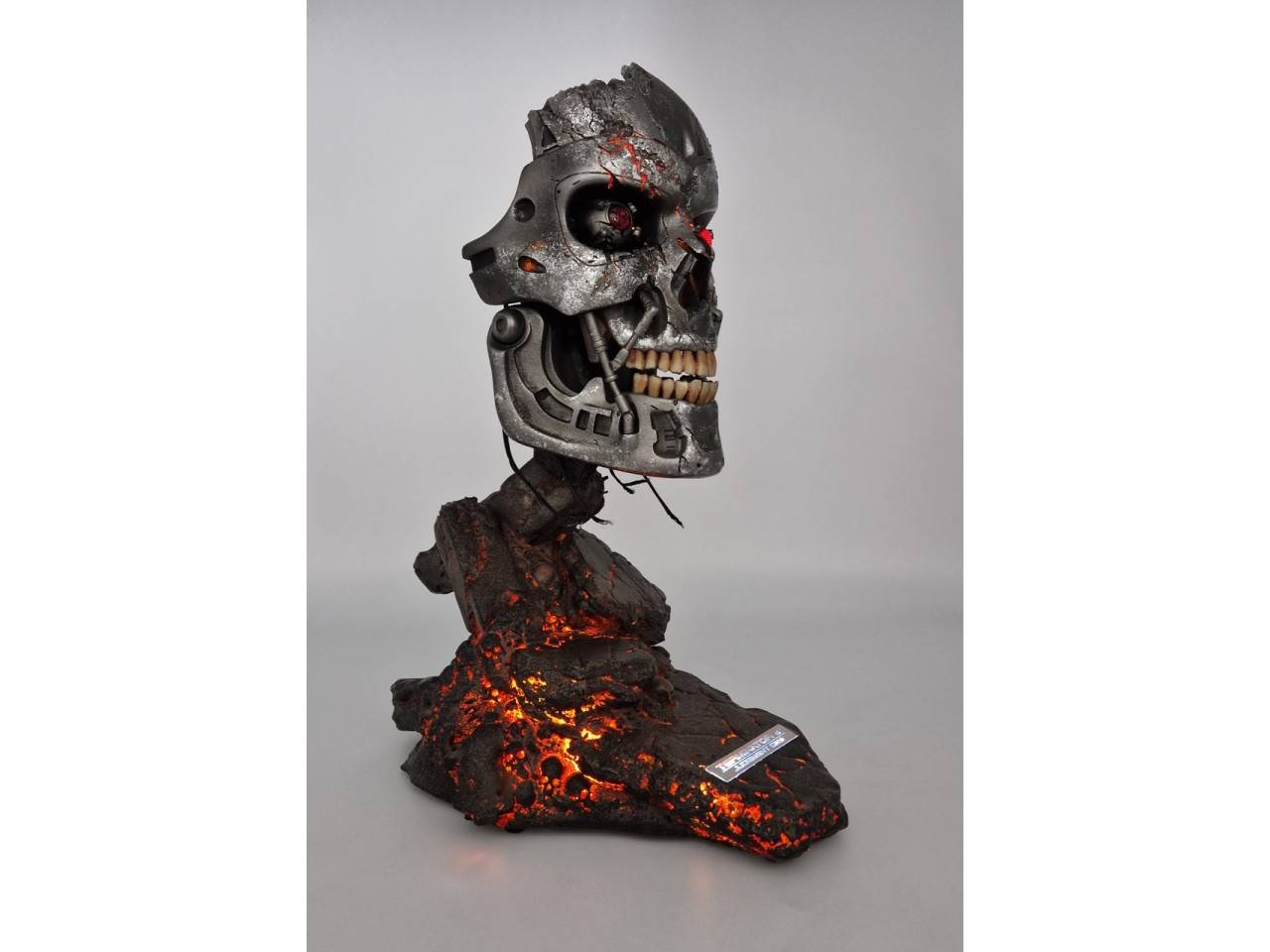 Découvrez la réplique exacte du crane du T-800, le robot emblématique du film Terminator. Ce masque, que vous pouvez librement accrochez au mur ou laissez poser sur sa base représentant la ville en ruine après le Jour du “Jugement Dernier”, vous surprendra par son apparence plus vraie que nature et ses minutieux détails.