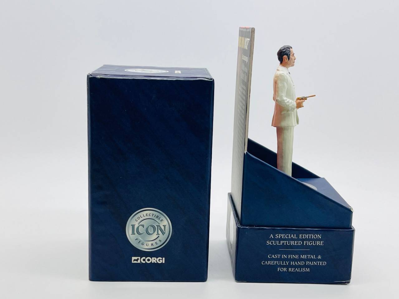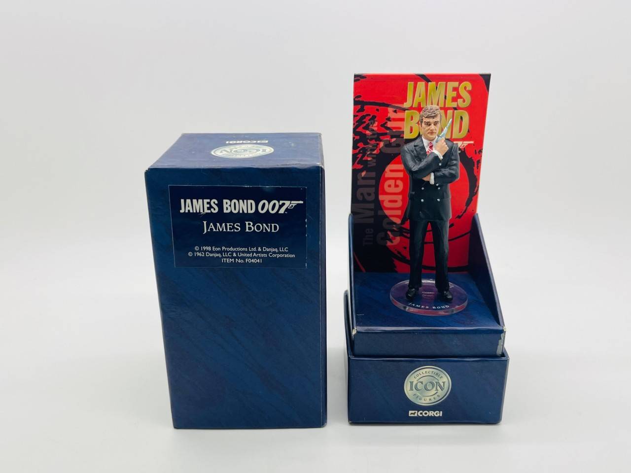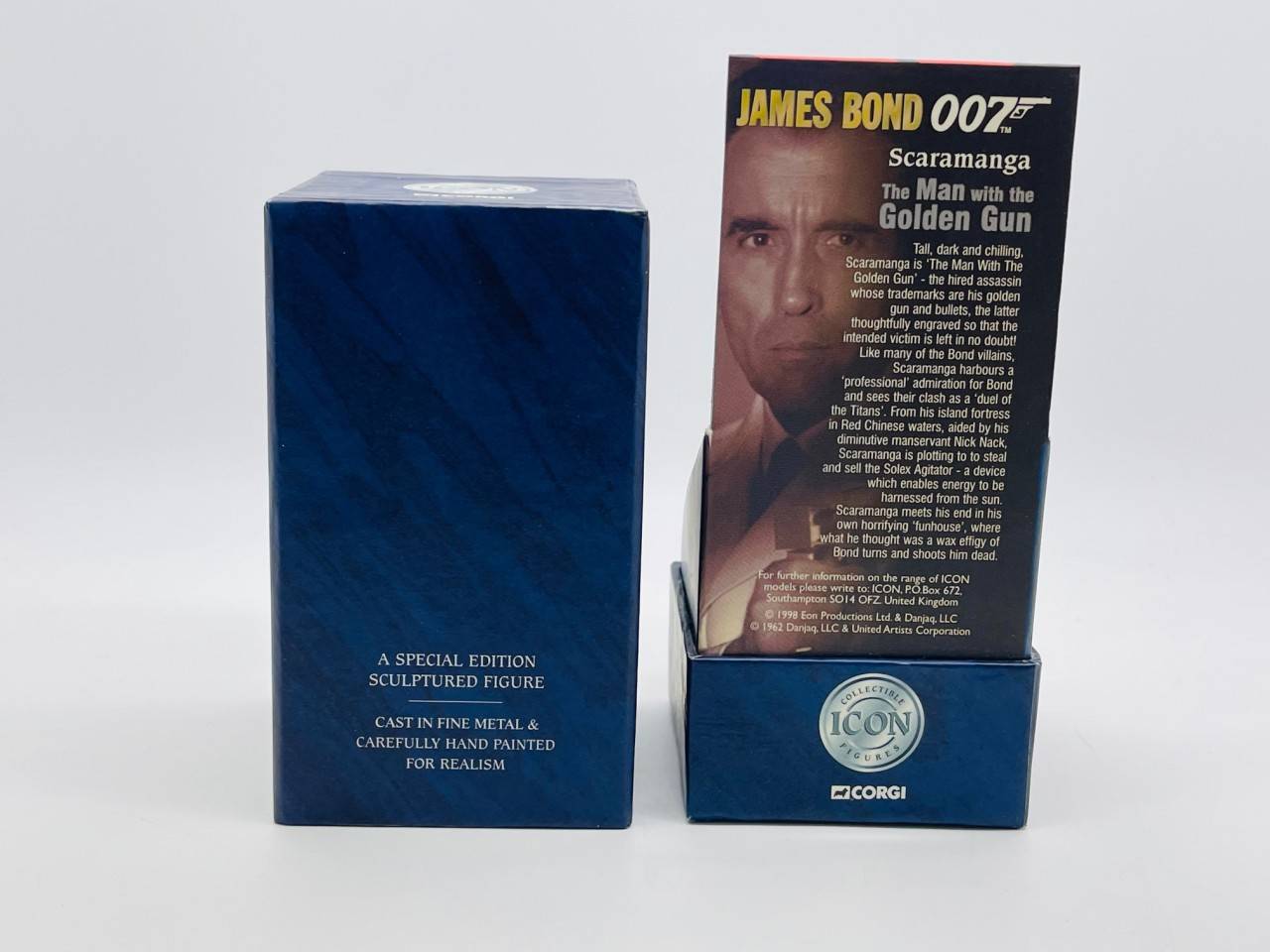 Superbe ensemble de 2 figurines James Bond 007 fabriquées fin années 90 par Corgi Toys série Icon, très bon état en boîtes d'origines illustrées. Lot comprenant : James Bond (R.Moore), Scaramanga.