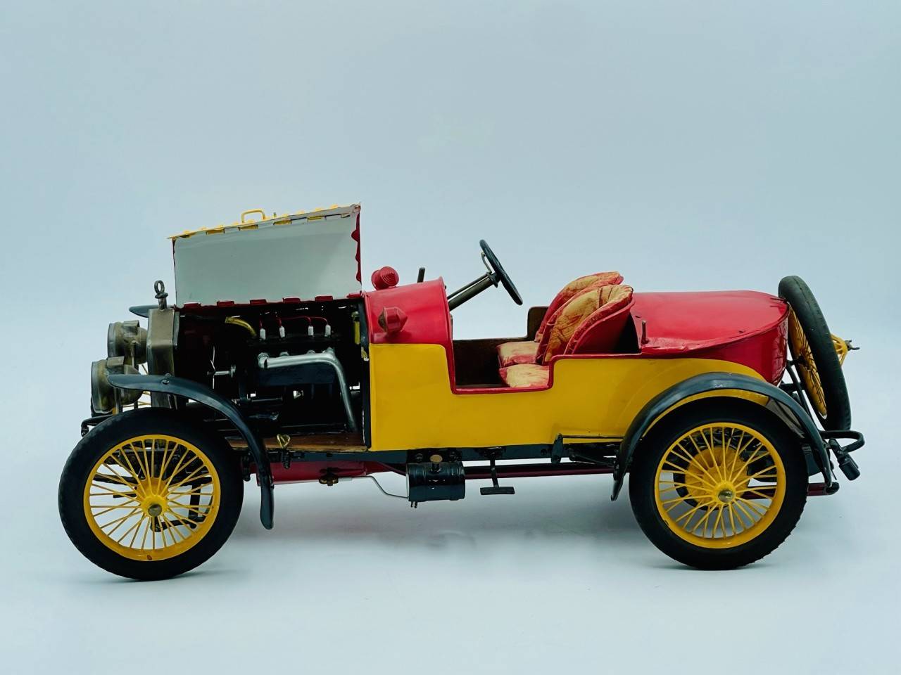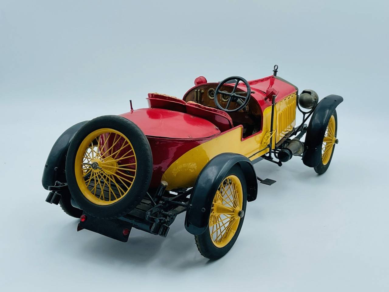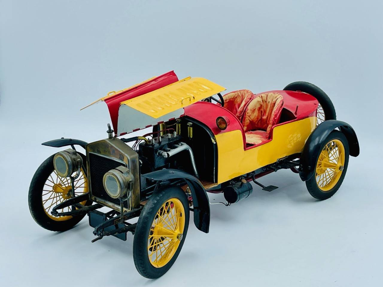 Cette rare réalisation semble être la reproduction d'une Hispano Suiza en métal, voiture avant-guerre fabriquée par un artisan, direction fonctionnelle, parties ouvrantes…
