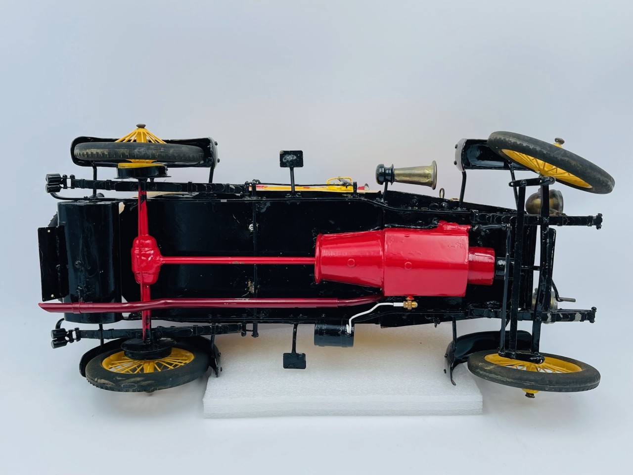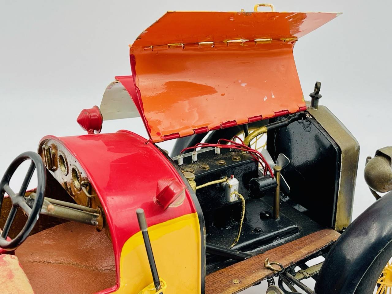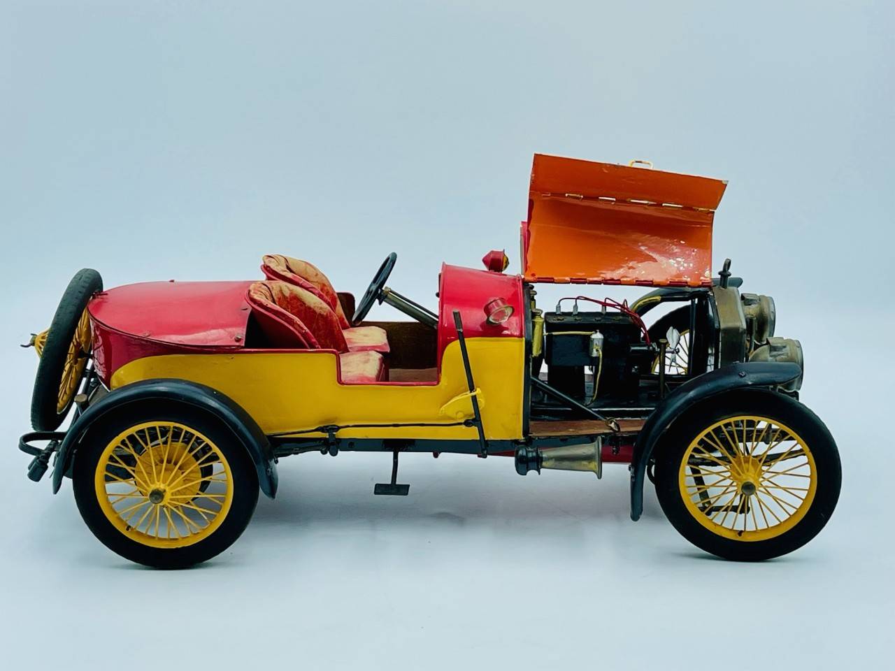 Cette rare réalisation semble être la reproduction d'une Hispano Suiza en métal, voiture avant-guerre fabriquée par un artisan, direction fonctionnelle, parties ouvrantes…