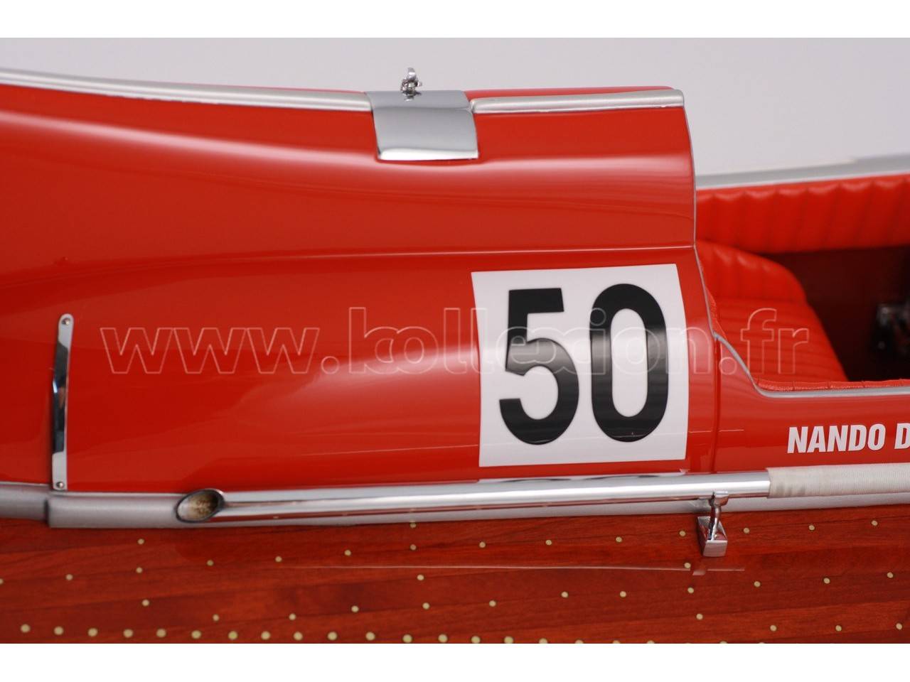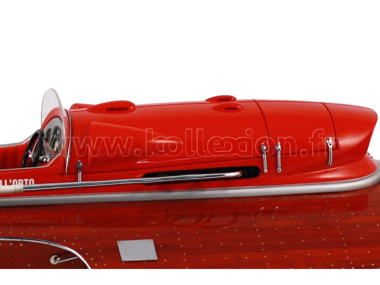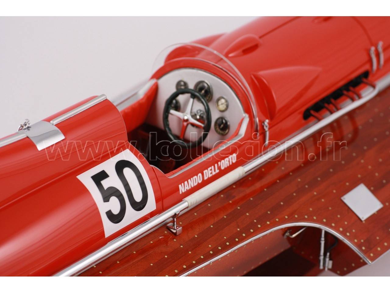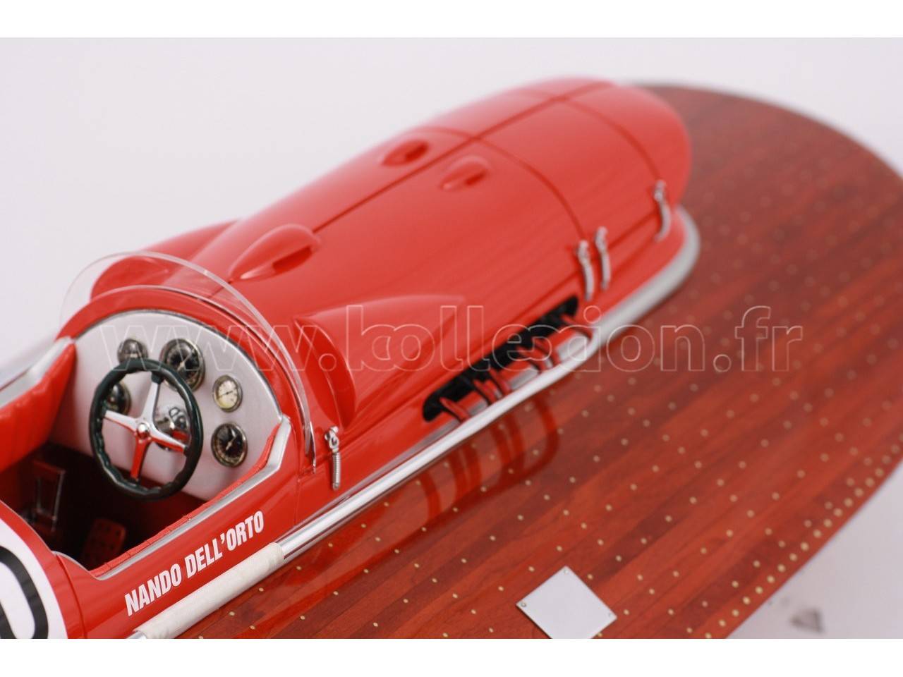 Véritable objet d’exception, cette maquette du Arno XI ( moteur Ferrari) d’une longueur de 91 cm a été réalisée à l’échelle 1/7ème. Fidèle réplique du mythique hydroplane, cette maquette est entièrement réalisée à la main à partir de matériau noble : Acajou pour le bois et véritable sellerie marine. Toutes les pièces d’accastillage sont en laiton chromé réalisées sur mesure par par des bijoutiers. 10 couches de vernis sont appliquées pour obtenir une excellente brillance et profondeur de vernis.