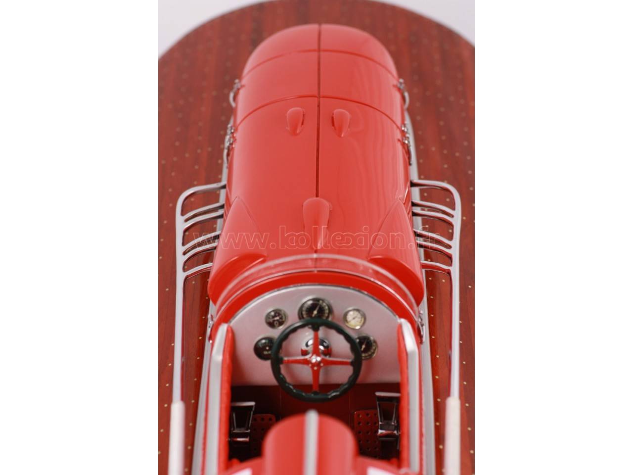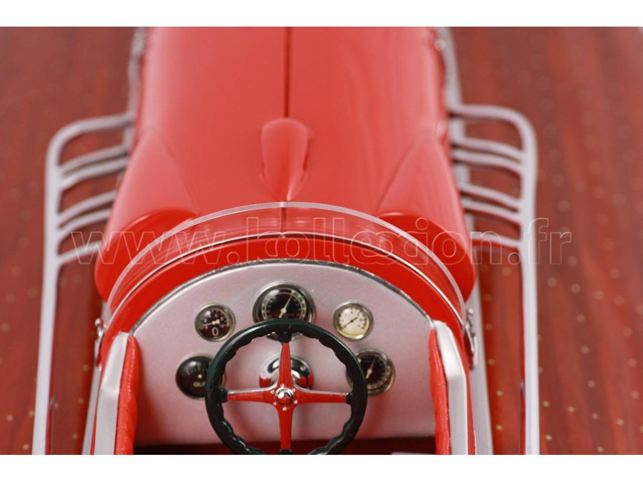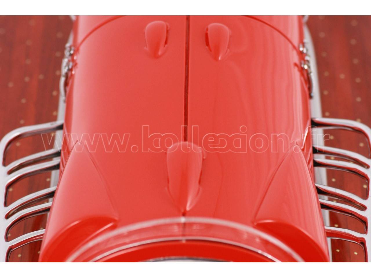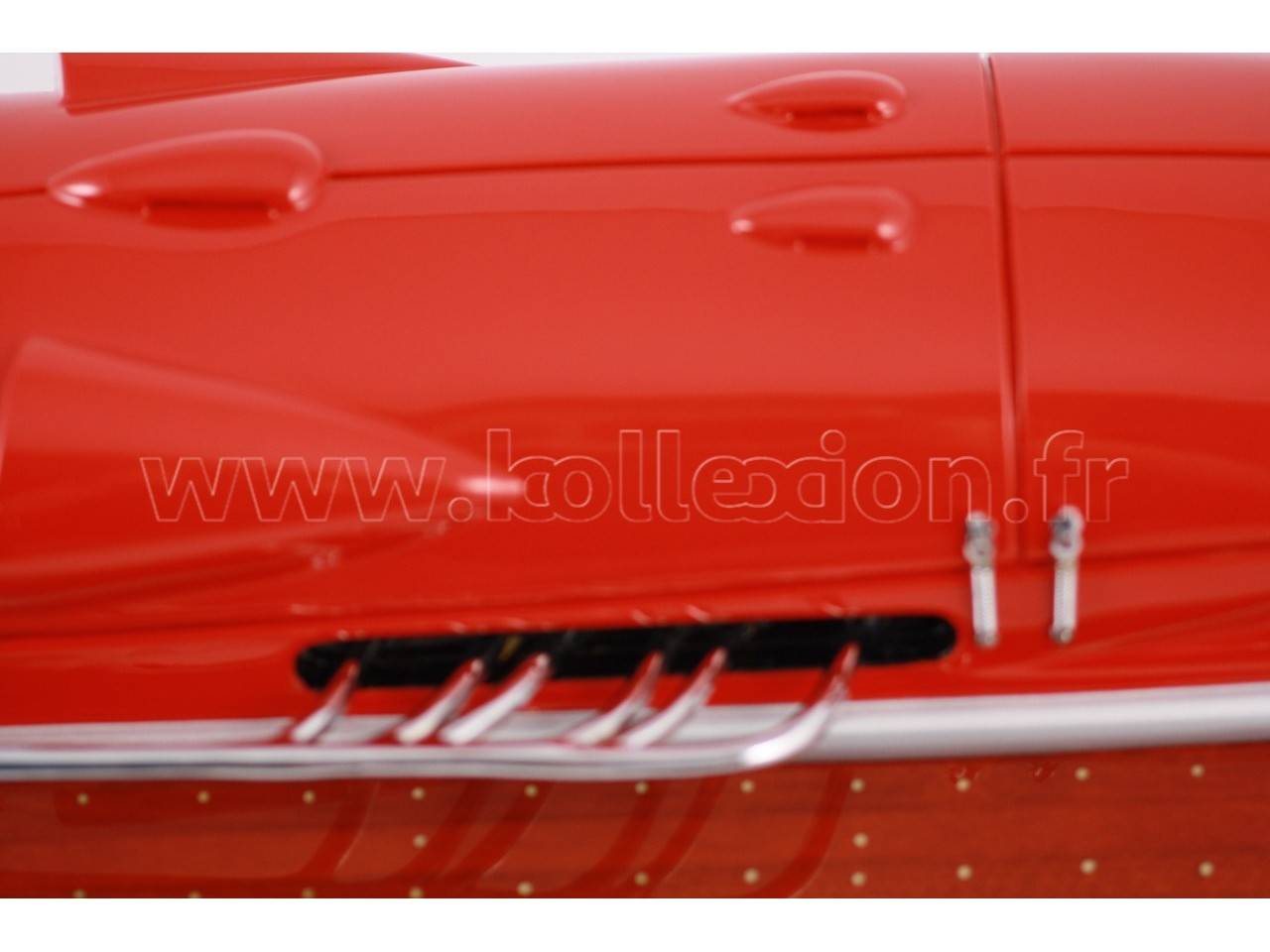 Véritable objet d’exception, cette maquette du Arno XI ( moteur Ferrari) d’une longueur de 91 cm a été réalisée à l’échelle 1/7ème. Fidèle réplique du mythique hydroplane, cette maquette est entièrement réalisée à la main à partir de matériau noble : Acajou pour le bois et véritable sellerie marine. Toutes les pièces d’accastillage sont en laiton chromé réalisées sur mesure par par des bijoutiers. 10 couches de vernis sont appliquées pour obtenir une excellente brillance et profondeur de vernis.