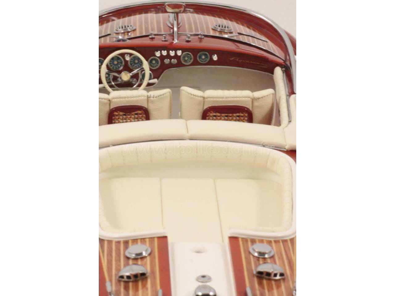 Véritable objet d’exception, cette maquette officielle du RIVA AQUARAMA SPECIAL, d’une longueur de 58 cm a été réalisée à l’échelle 1/15ème. Fidèle réplique du mythique Aquarama Spécial, cette maquette officielle exclusive est entièrement réalisée à la main à partir de matériau noble : Acajou pour le bois et véritable sellerie marine. Toutes les pièces d’accastillage sont en laiton chromé réalisées sur mesure par par des bijoutiers. 10 couches de vernis sont appliquées pour obtenir une excellente brillance et profondeur de vernis.