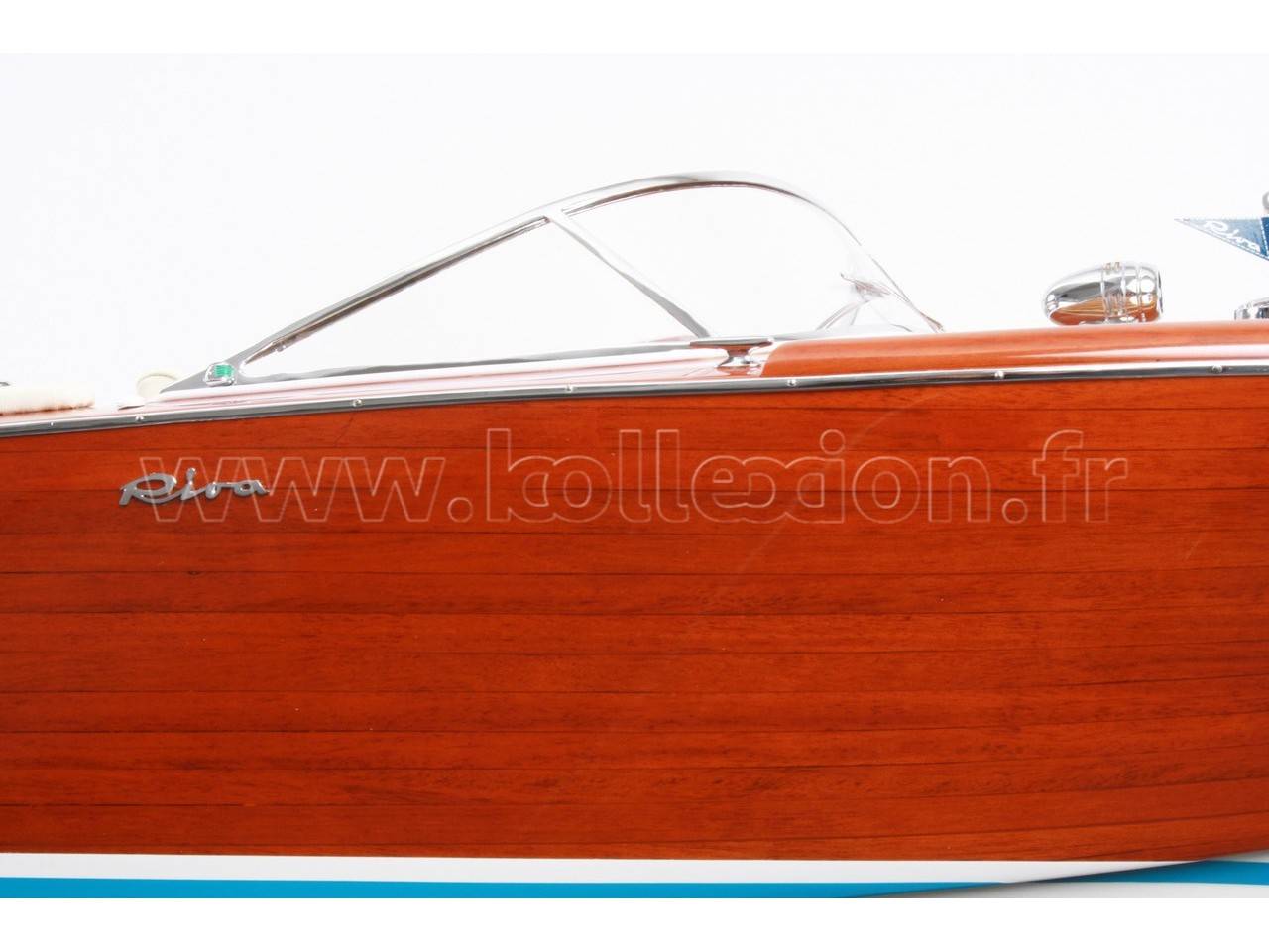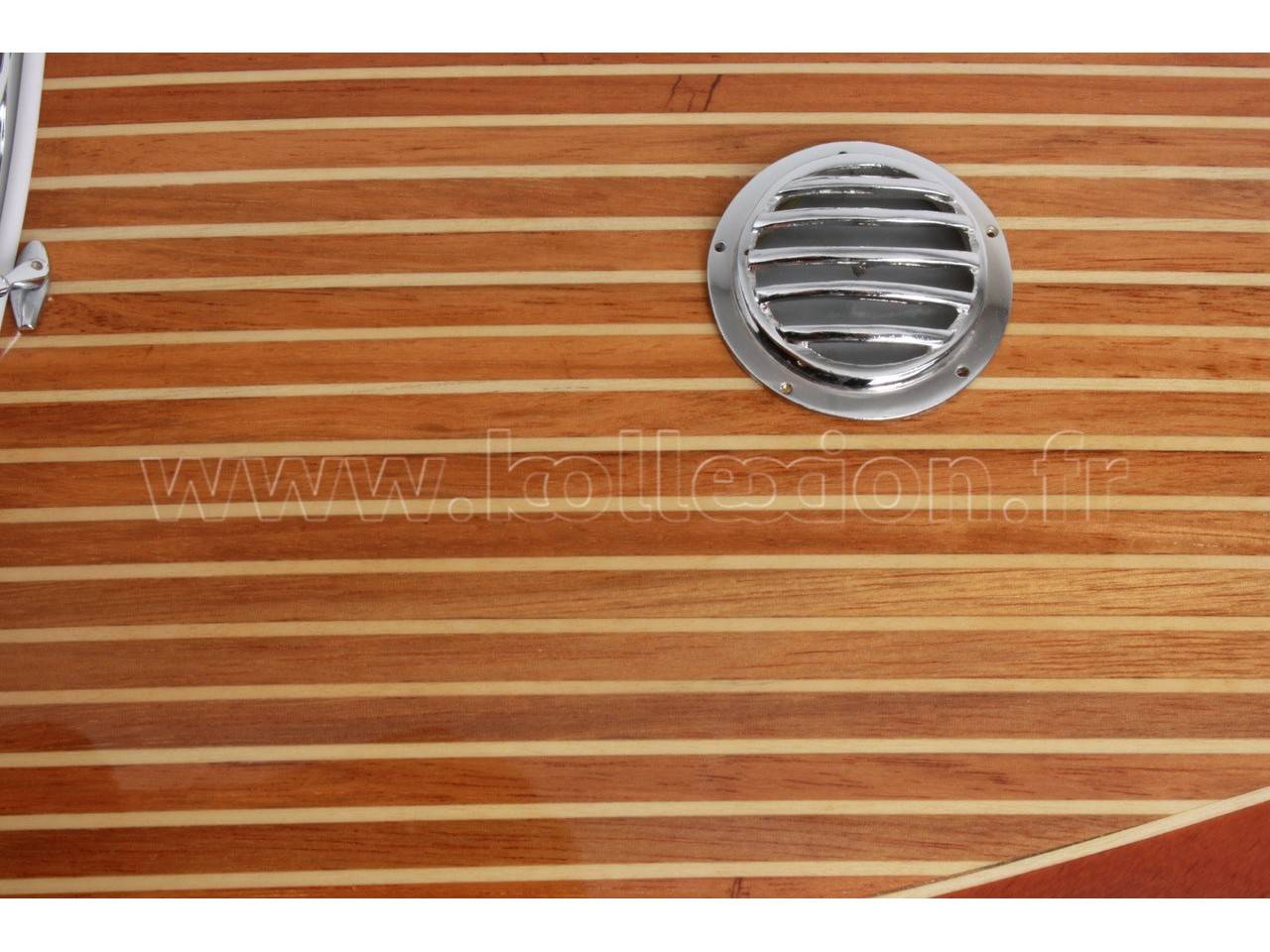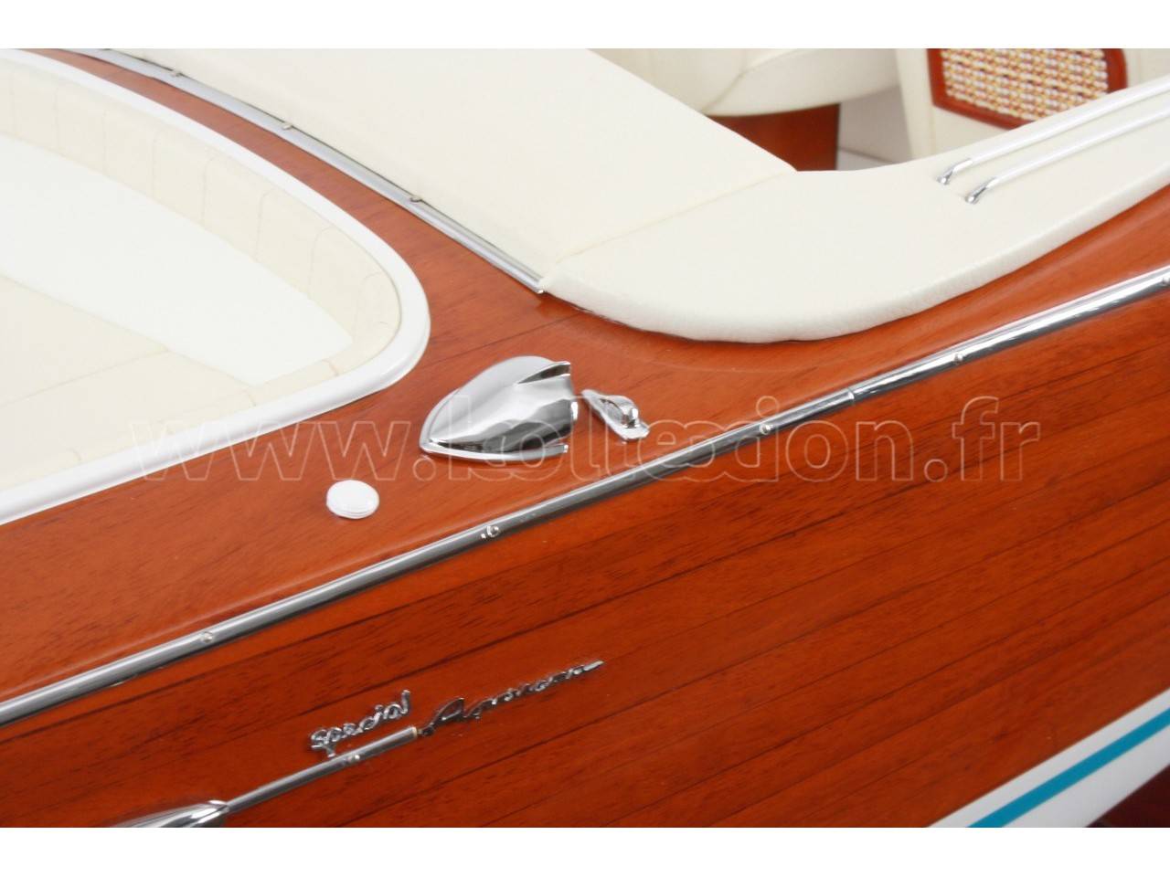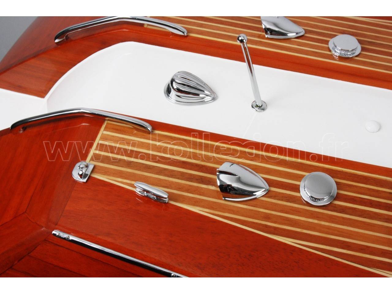 Véritable objet d’exception, cette maquette Riva Aquarama Spécial d’une longueur de 1,25m a été réalisée à l’échelle 1/7ème. Fidèle réplique du mythique Aquarama Spécial, cette maquette officielle exclusive est entièrement réalisée à la main à partir de matériau noble: Acajou pour le bois et véritable sellerie marine. Toutes les pièces d’accastillage sont en laiton chromé réalisées sur mesure par par des bijoutiers. 10 couches de vernis sont appliquées pour obtenir une excellente brillance et profondeur de vernis.