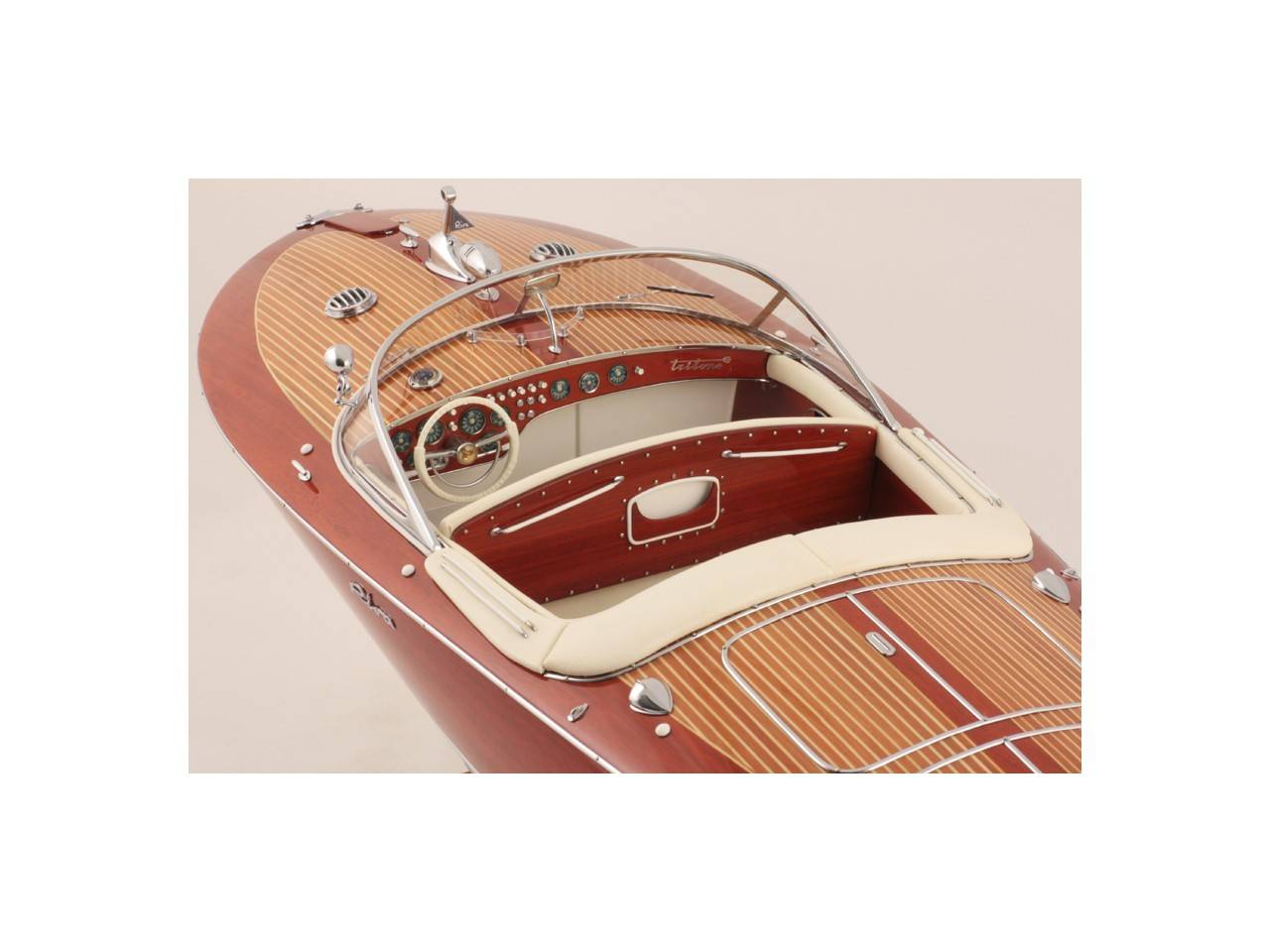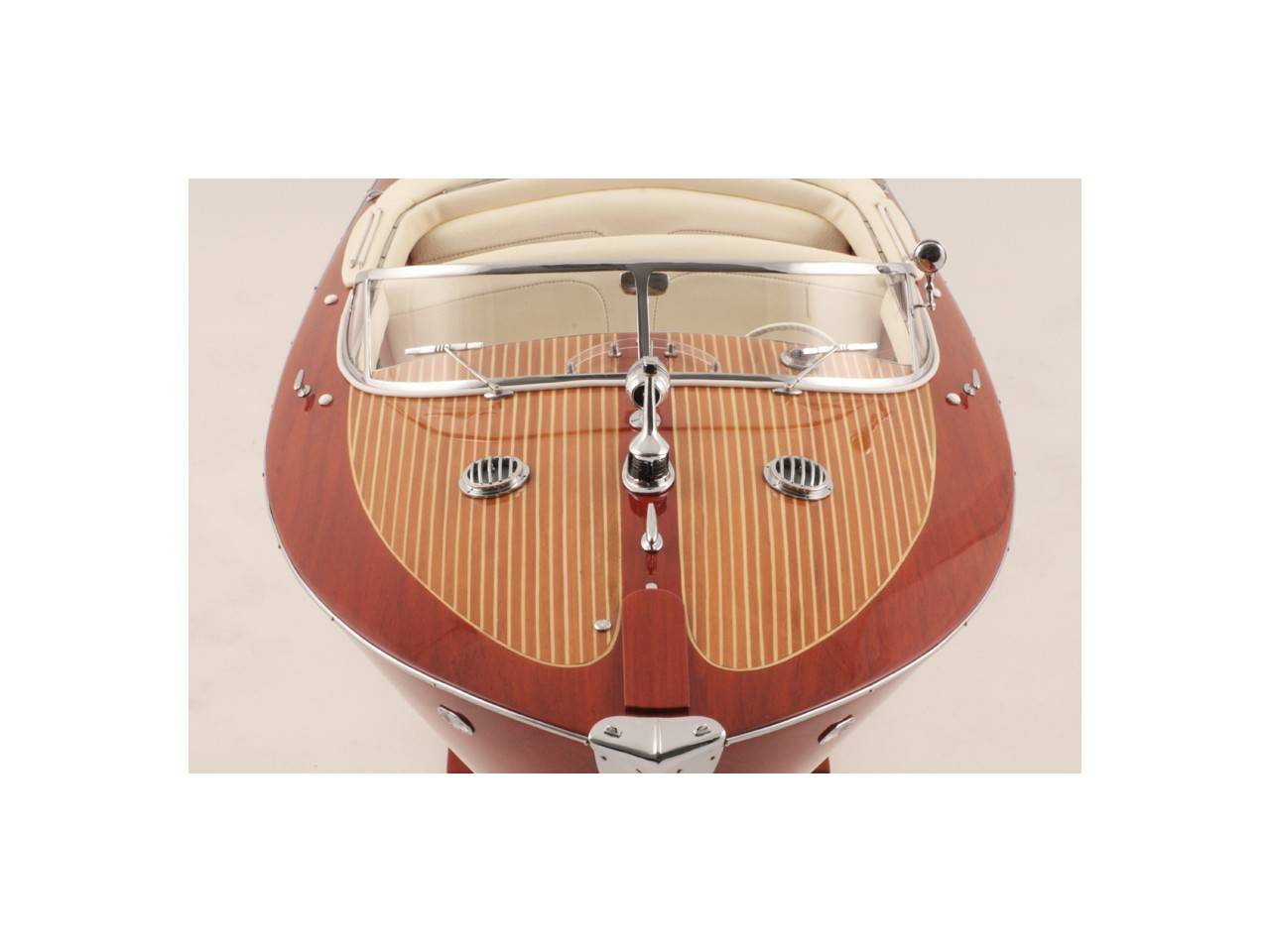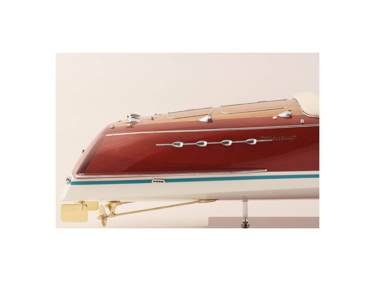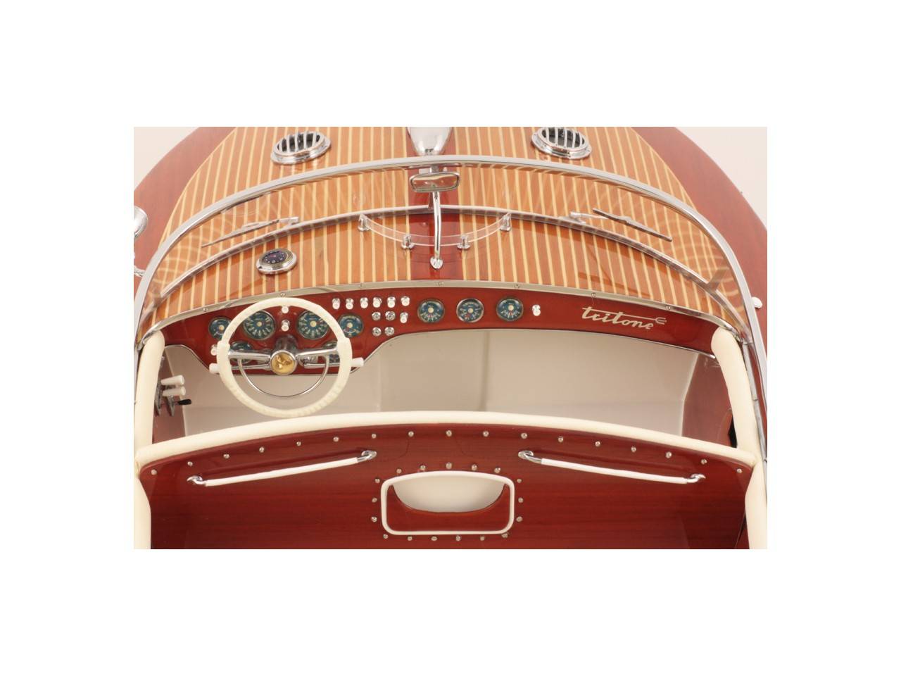 Véritable objet d’exception, cette maquette d’une longueur de 82 cm a été réalisée à l’échelle 1/10ème. Fidèle réplique du prestigieux Riva Tritone, cette maquette officielle exclusive est entièrement réalisée à la main à partir de matériau noble : Bois véritable et sellerie marine. Toutes les pièces d’accastillage sont en laiton chromé réalisées sur mesure par par des bijoutiers. 10 couches de vernis sont appliquées pour obtenir une excellente brillance et profondeur de vernis.