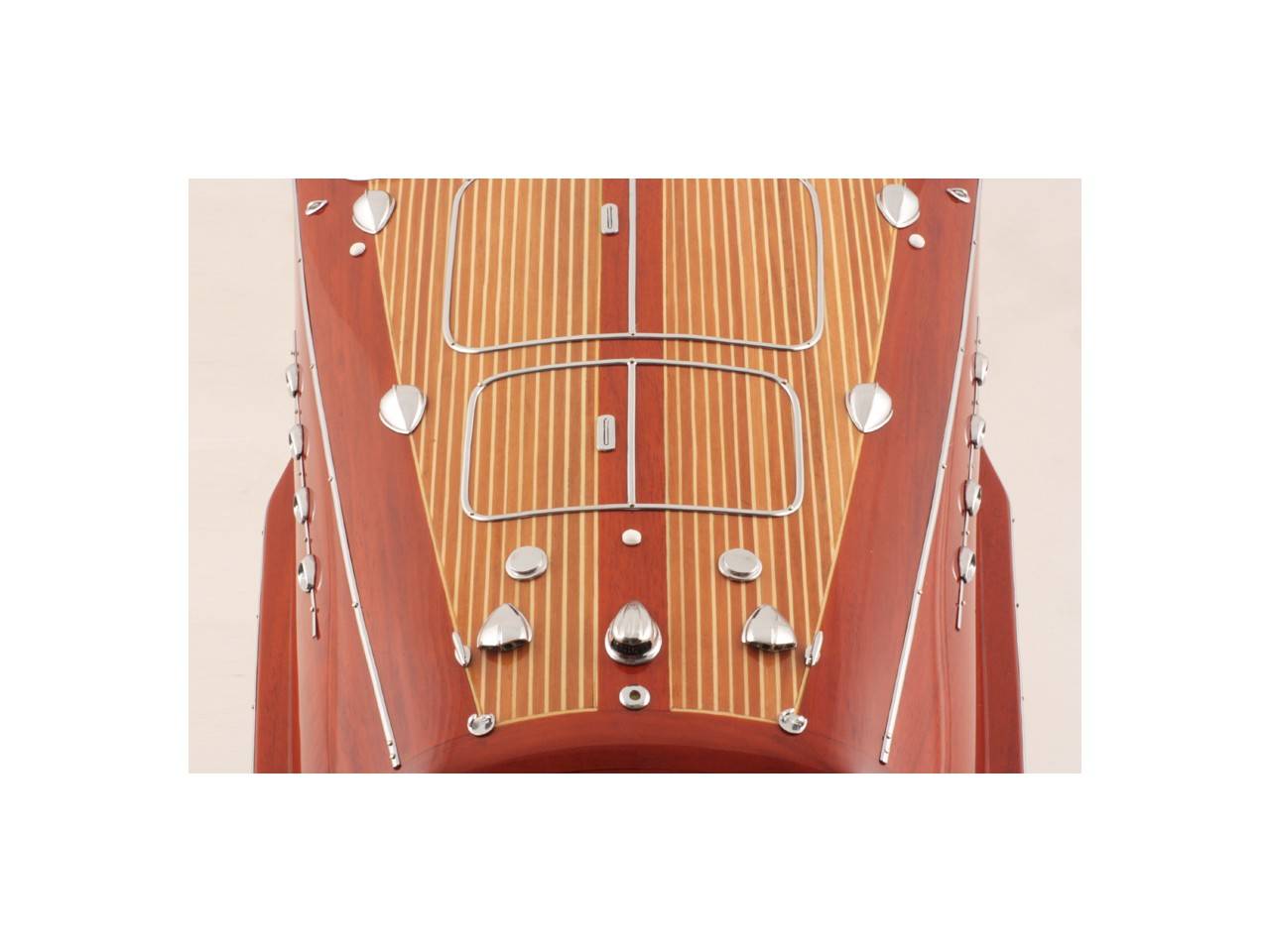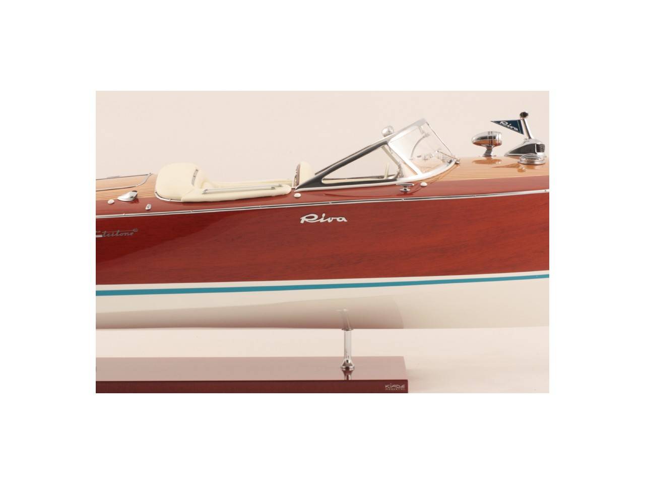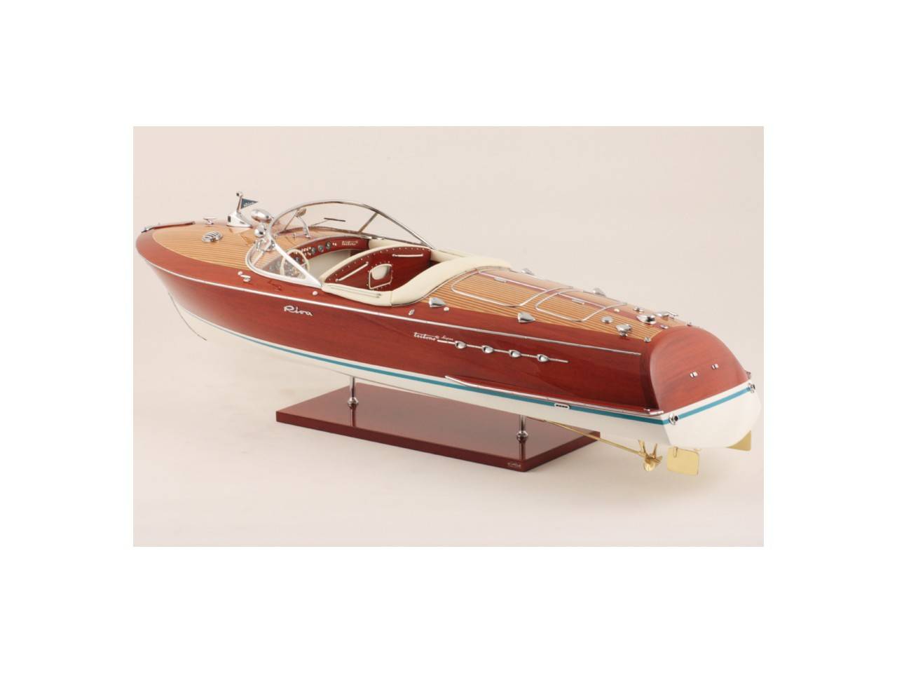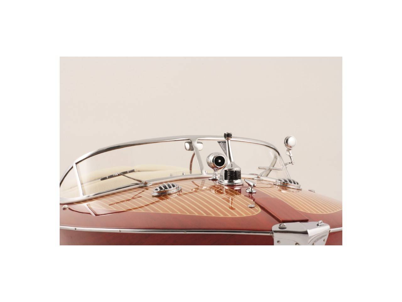 Véritable objet d’exception, cette maquette d’une longueur de 82 cm a été réalisée à l’échelle 1/10ème. Fidèle réplique du prestigieux Riva Tritone, cette maquette officielle exclusive est entièrement réalisée à la main à partir de matériau noble : Bois véritable et sellerie marine. Toutes les pièces d’accastillage sont en laiton chromé réalisées sur mesure par par des bijoutiers. 10 couches de vernis sont appliquées pour obtenir une excellente brillance et profondeur de vernis.
