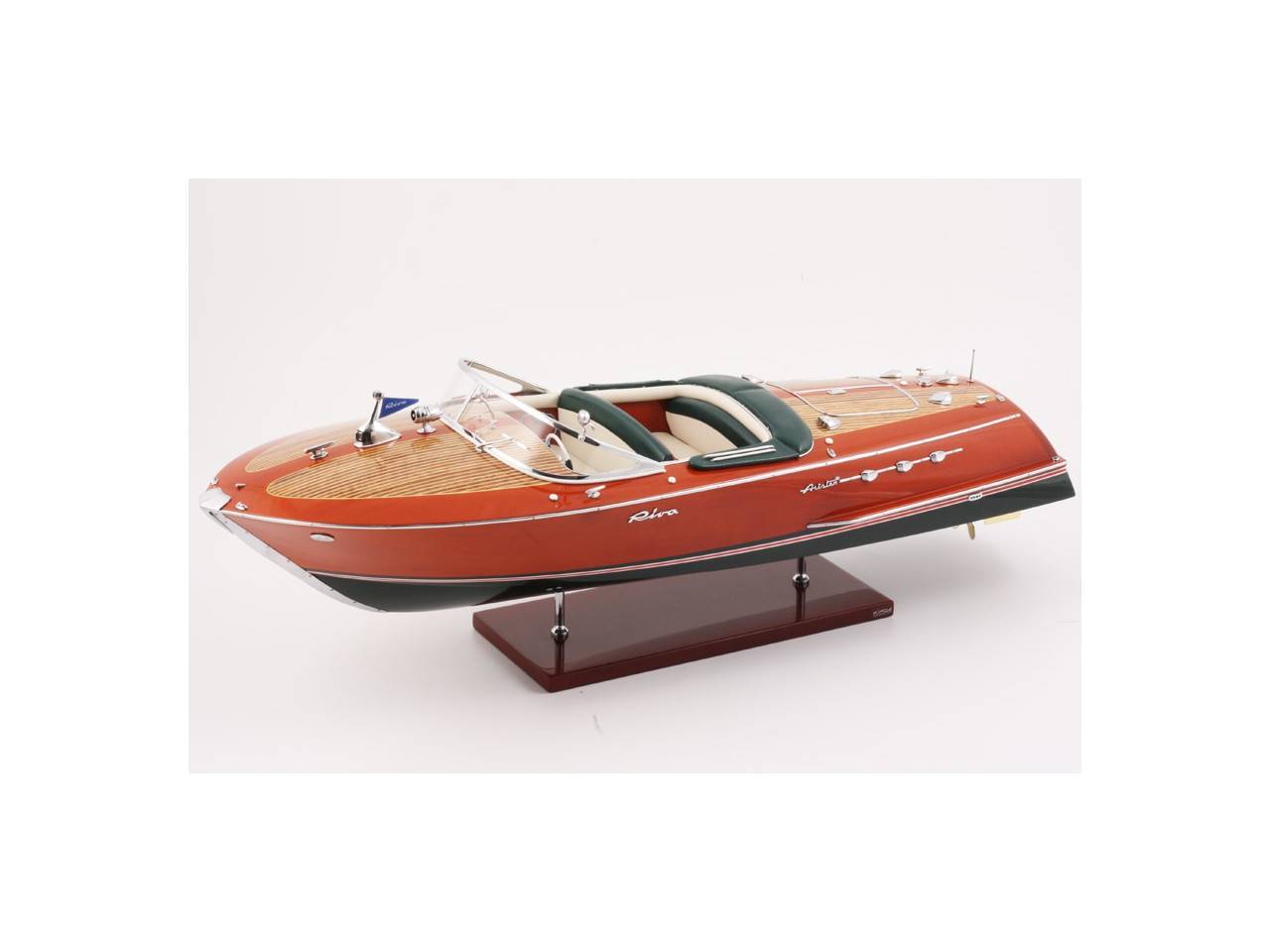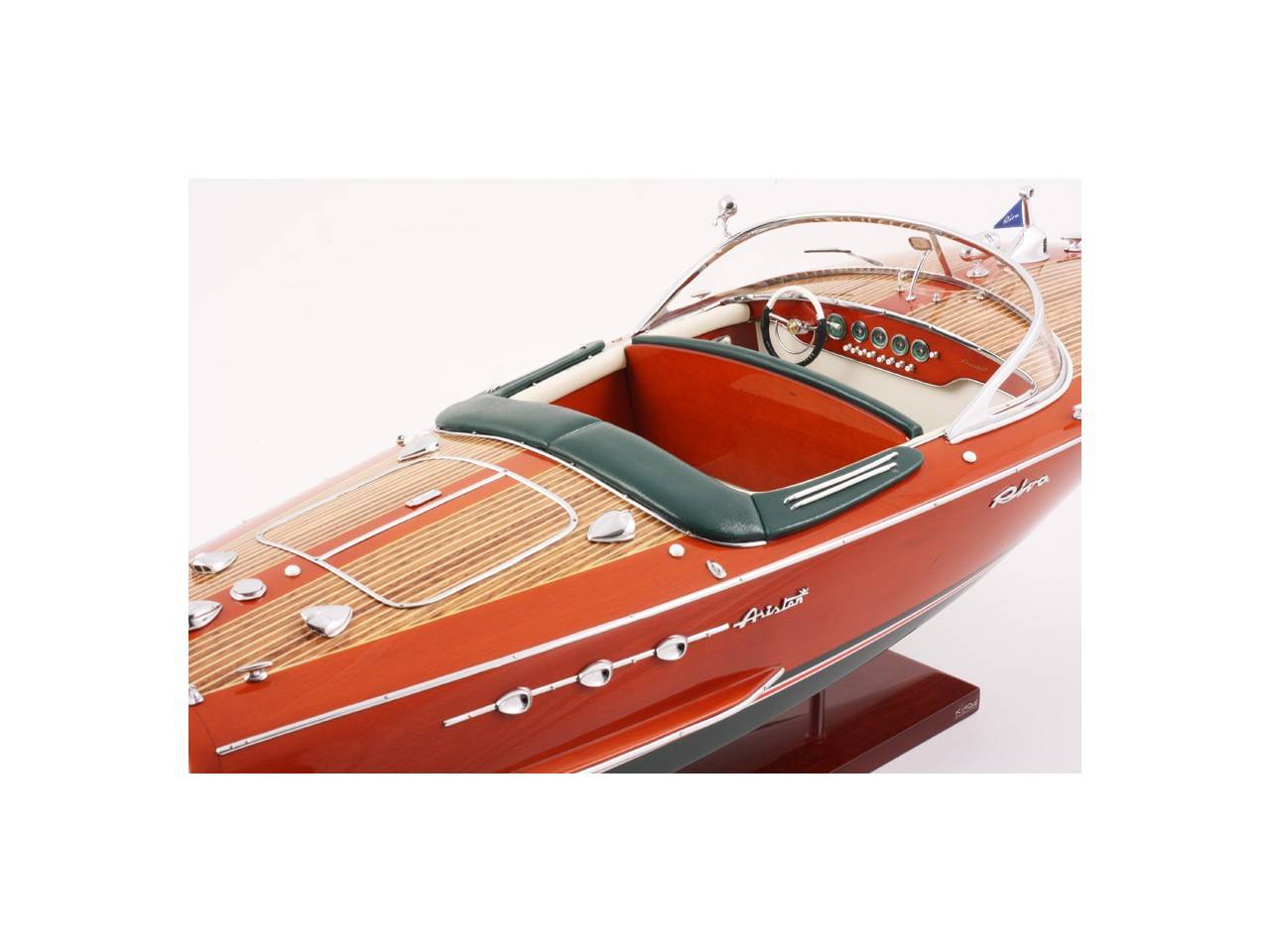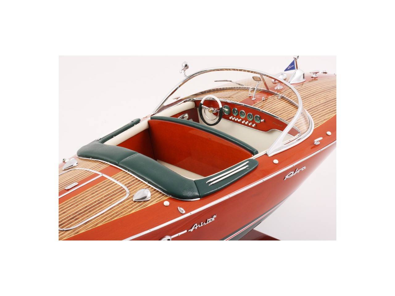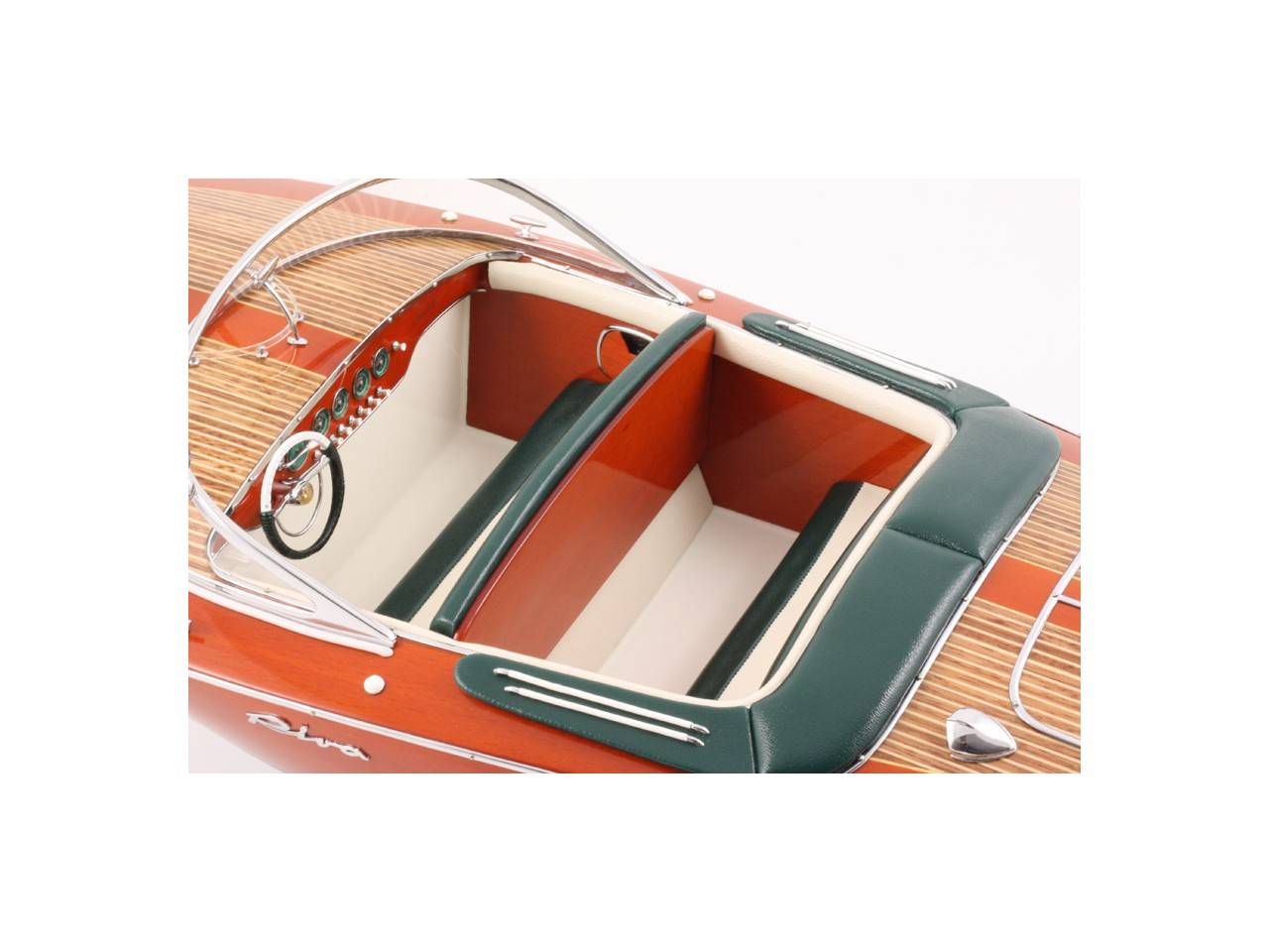 Véritable objet d’exception, cette maquette d’une longueur de 68 cm a été réalisée à l’échelle 1/10ème. Fidèle réplique de l’élégant Riva Ariston, cette maquette officielle exclusive est entièrement réalisée à la main à partir de matériau noble : Bois véritable et sellerie marine. Toutes les pièces d’accastillage sont en laiton chromé réalisées sur mesure par par des bijoutiers. 10 couches de vernis sont appliquées pour obtenir une excellente brillance et profondeur de vernis. Modèle proposé en sellerie verte et blanche. La maquette est livrée dans un double emballage sécurisé.
