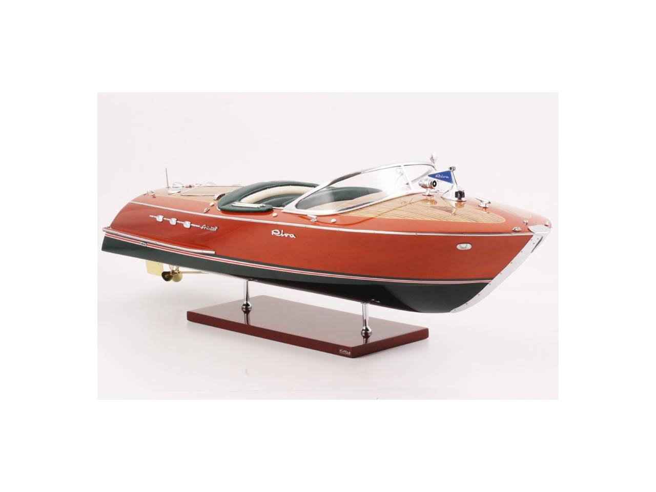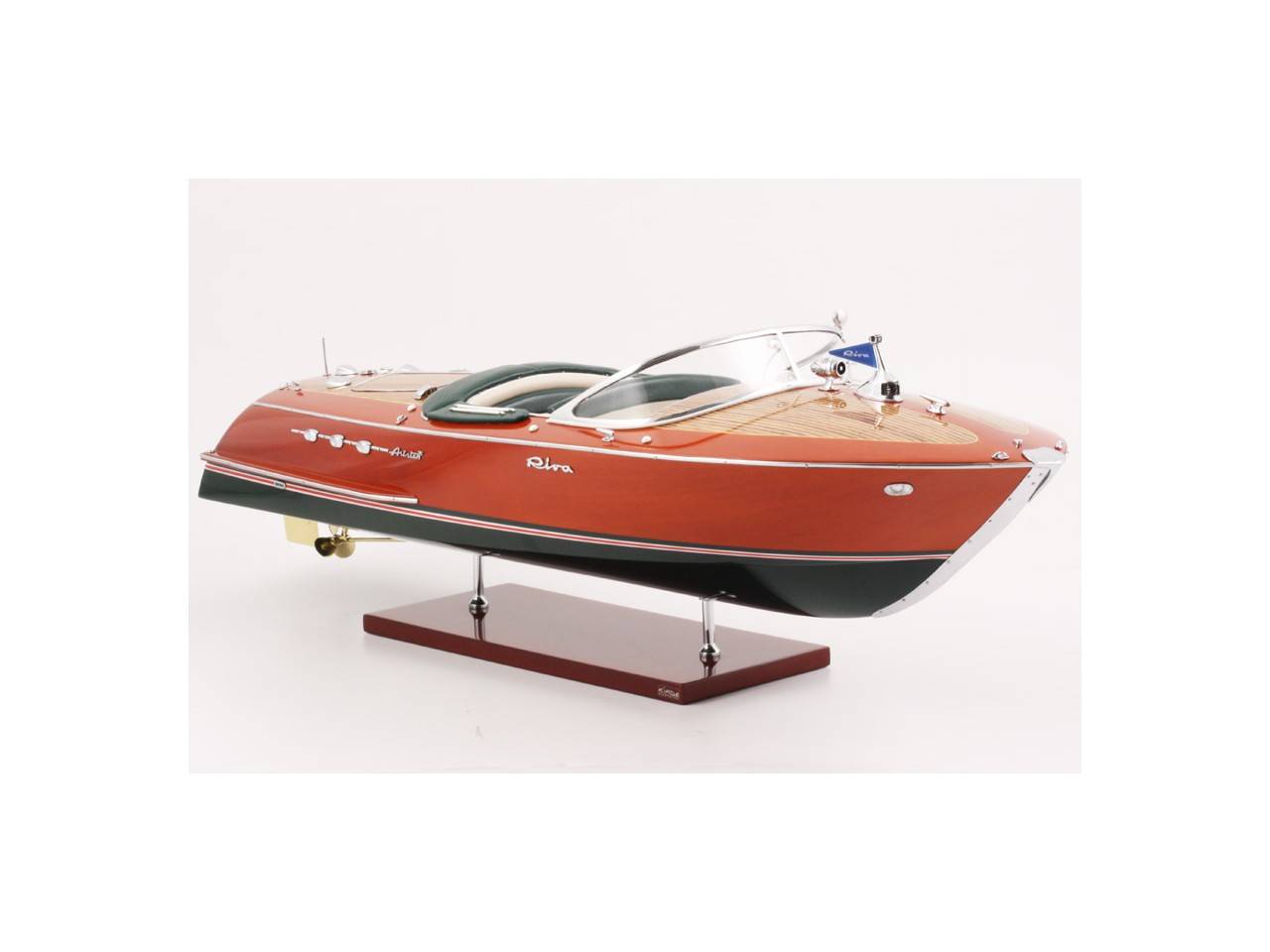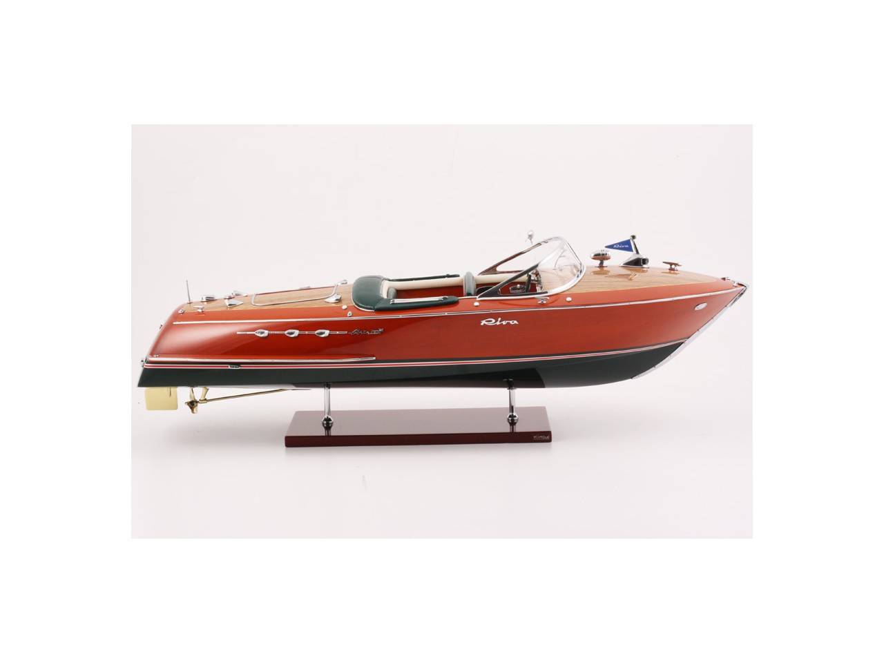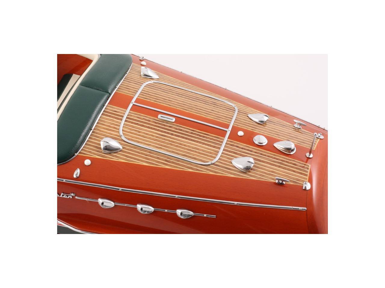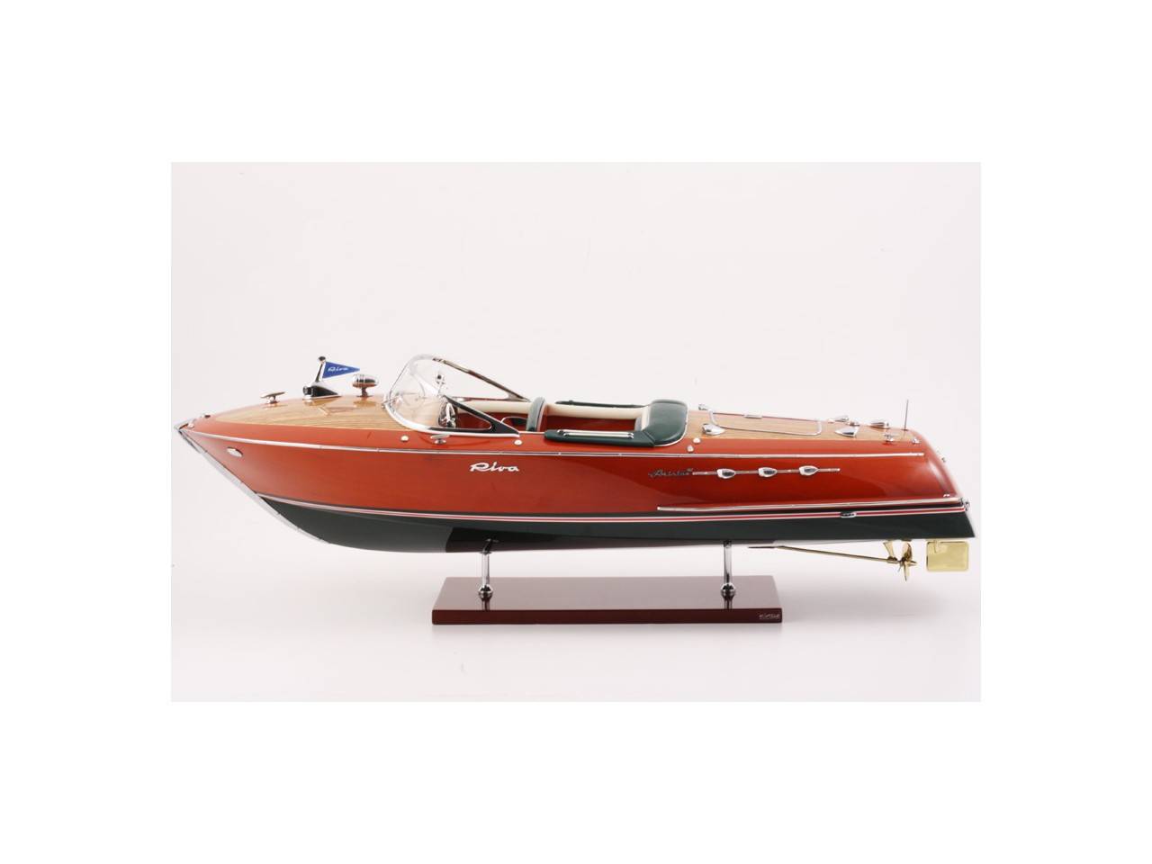 Véritable objet d’exception, cette maquette d’une longueur de 68 cm a été réalisée à l’échelle 1/10ème. Fidèle réplique de l’élégant Riva Ariston, cette maquette officielle exclusive est entièrement réalisée à la main à partir de matériau noble : Bois véritable et sellerie marine. Toutes les pièces d’accastillage sont en laiton chromé réalisées sur mesure par par des bijoutiers. 10 couches de vernis sont appliquées pour obtenir une excellente brillance et profondeur de vernis. Modèle proposé en sellerie verte et blanche. La maquette est livrée dans un double emballage sécurisé.