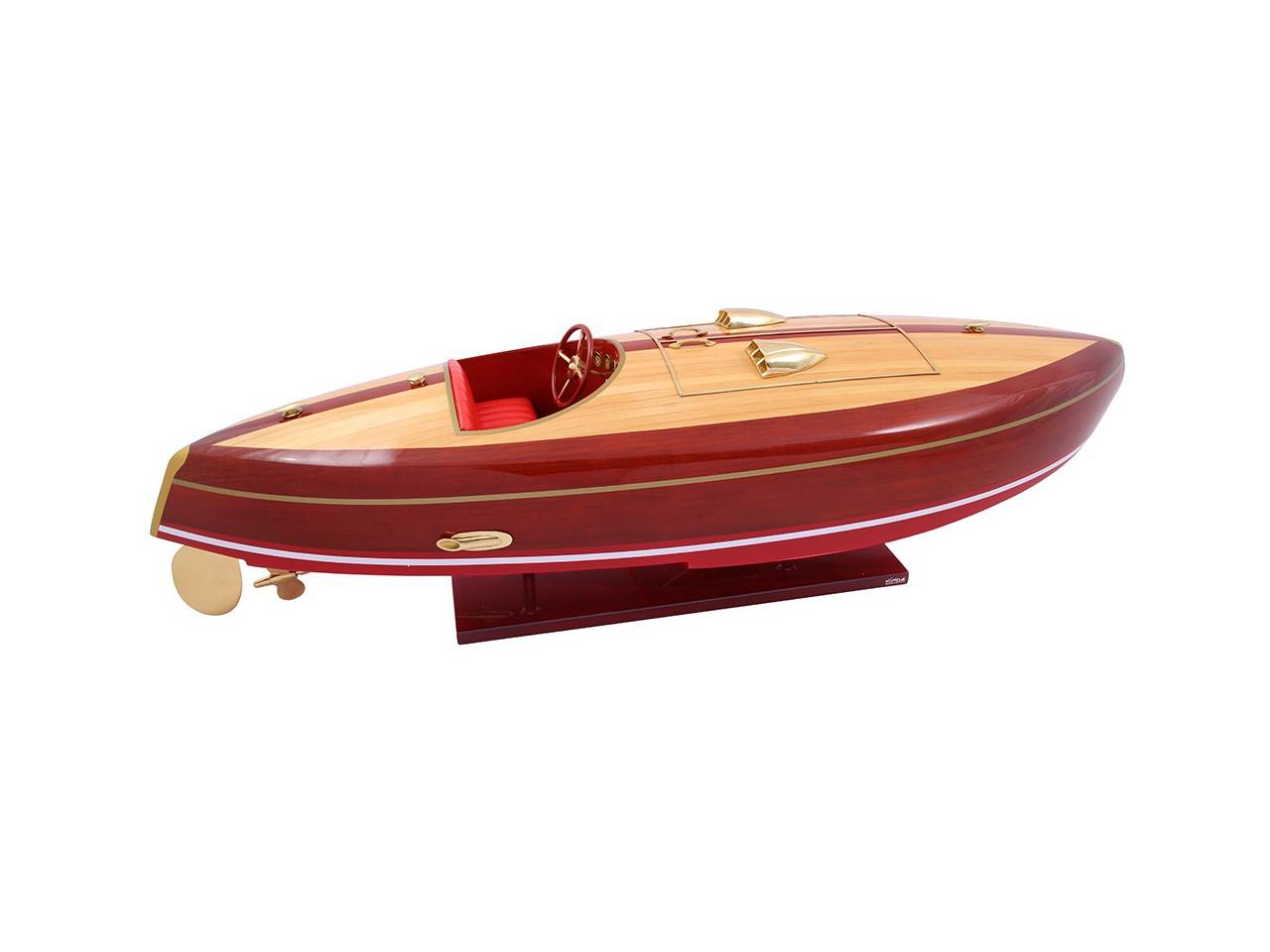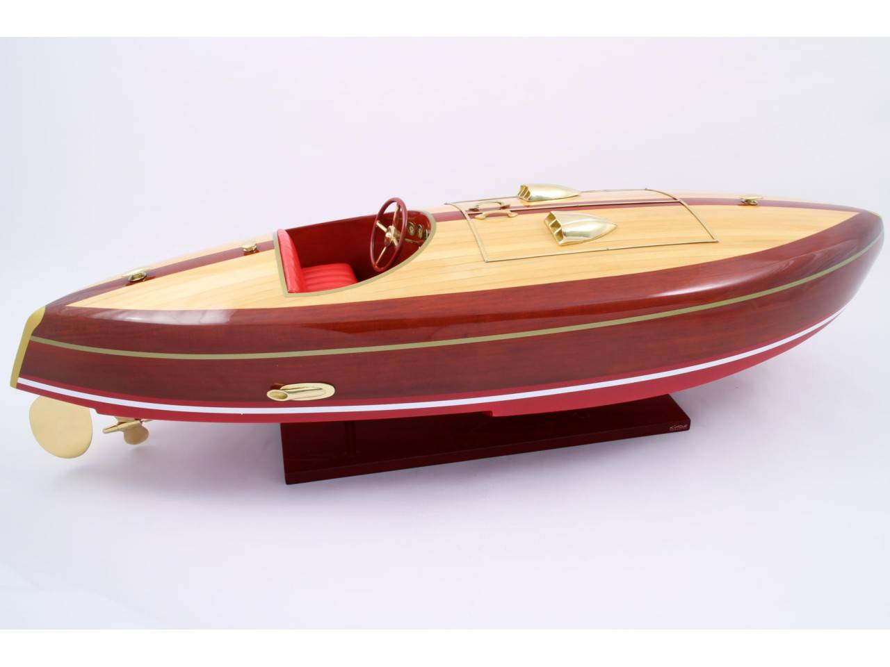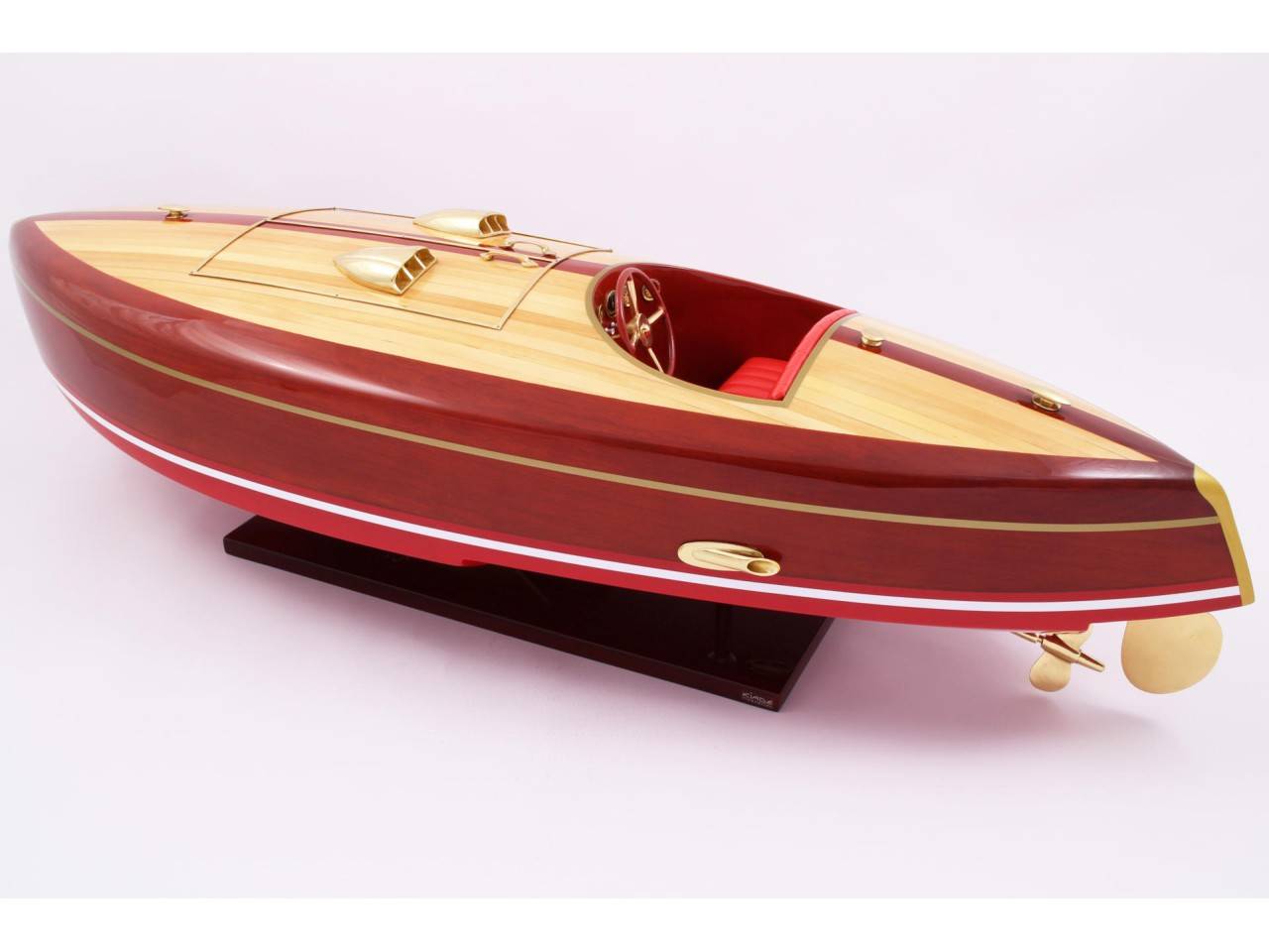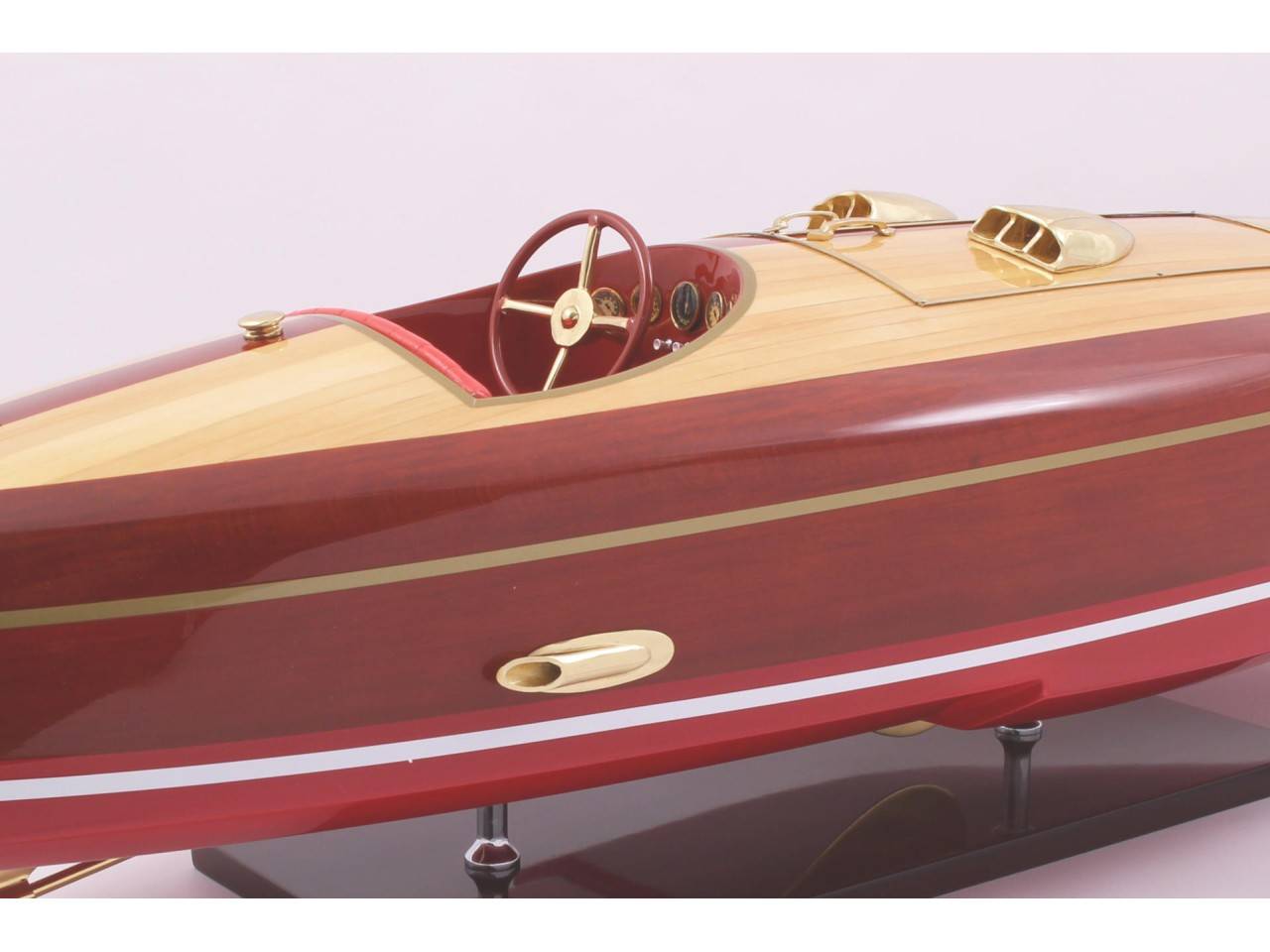 Véritable objet d’exception, cette maquette du FLYER d’une longueur de 82 cm a est très fidèle au modèle original. Celle-ci est entièrement réalisée à la main à partir de matériau noble : Bois véritable et sellerie marine. Toutes les pièces d’accastillage sont en laiton poli et verni, réalisées sur mesure par des bijoutiers. 10 couches de vernis sont appliquées pour obtenir une excellente brillance et profondeur de vernis.