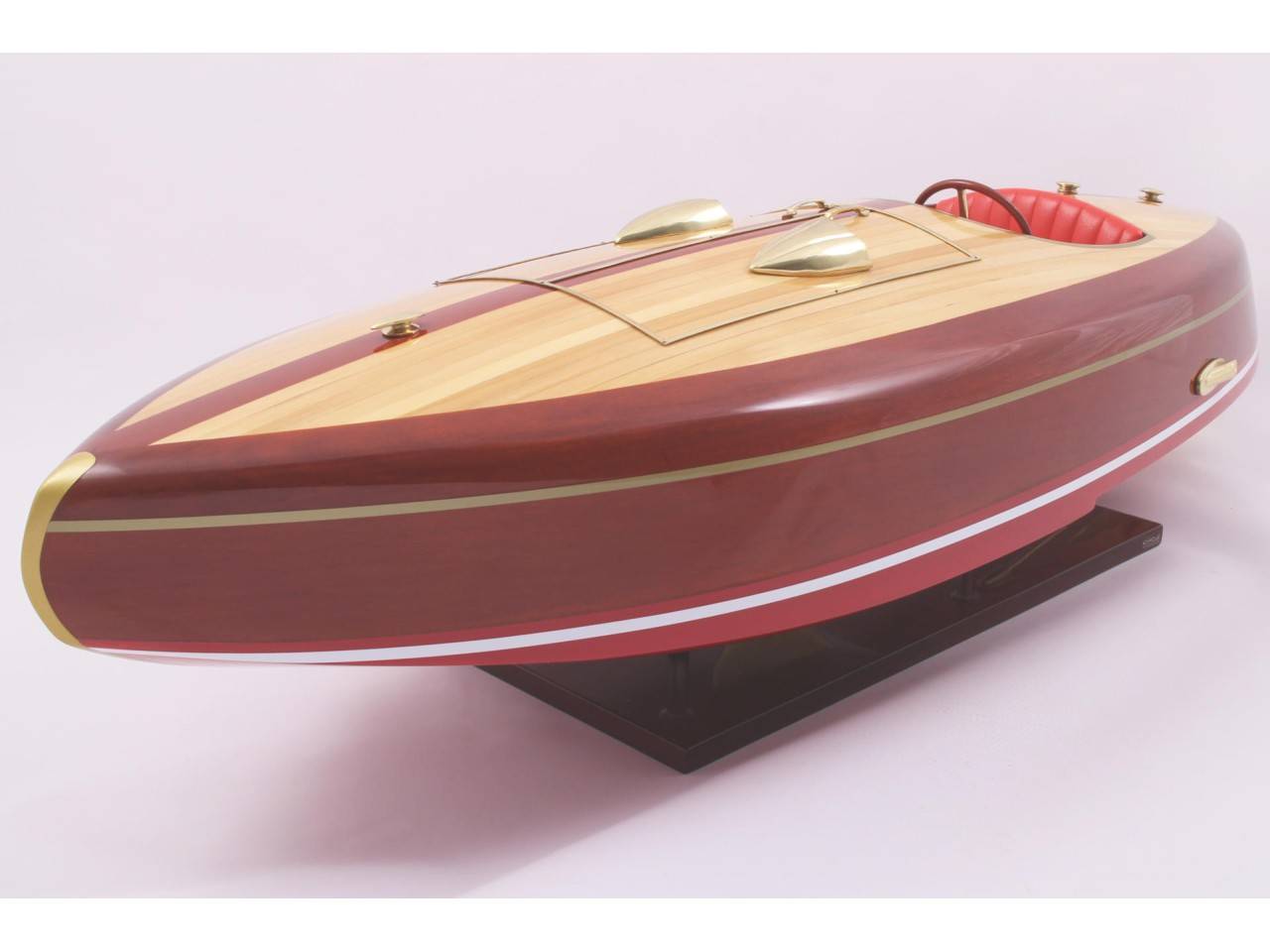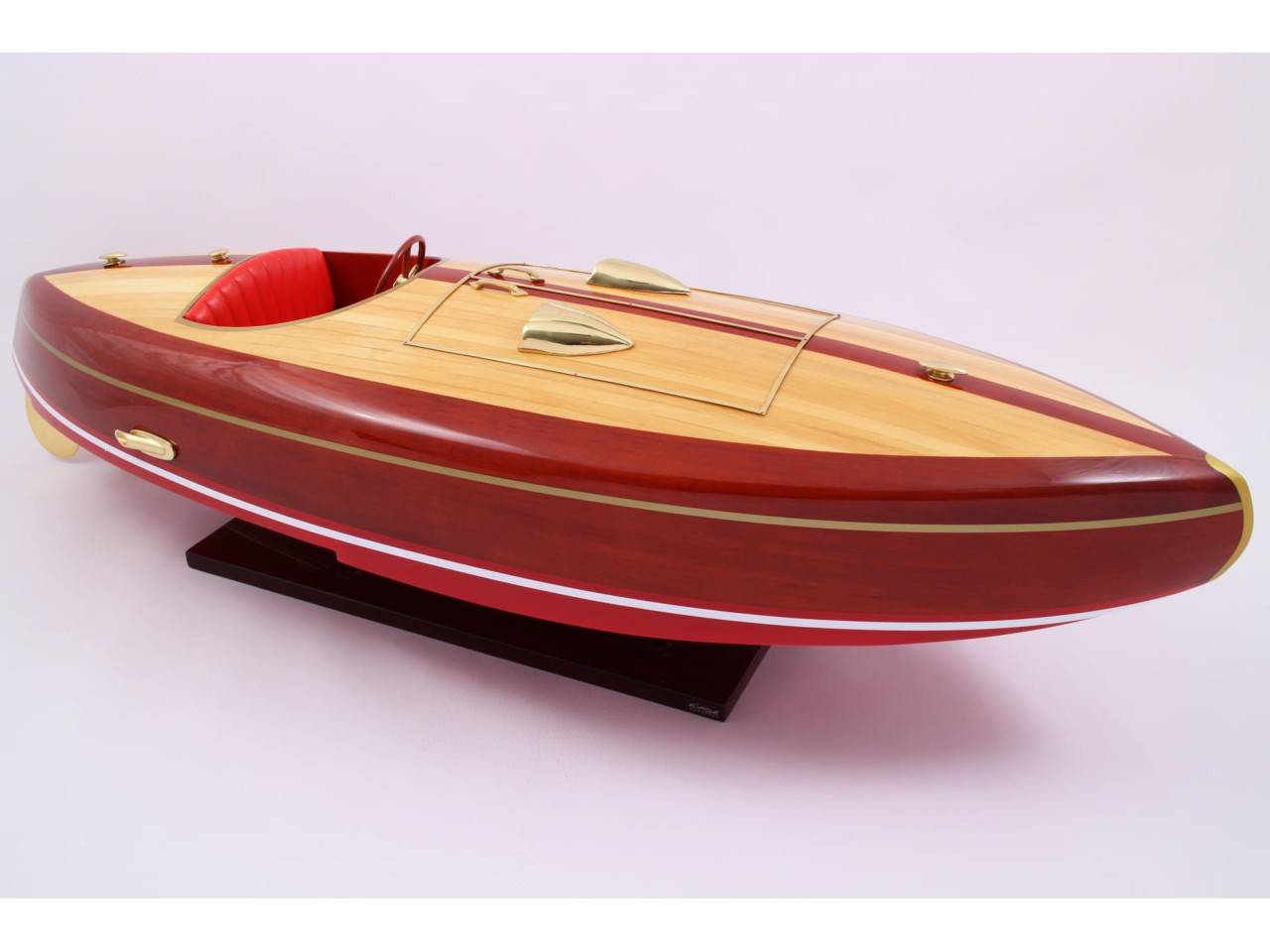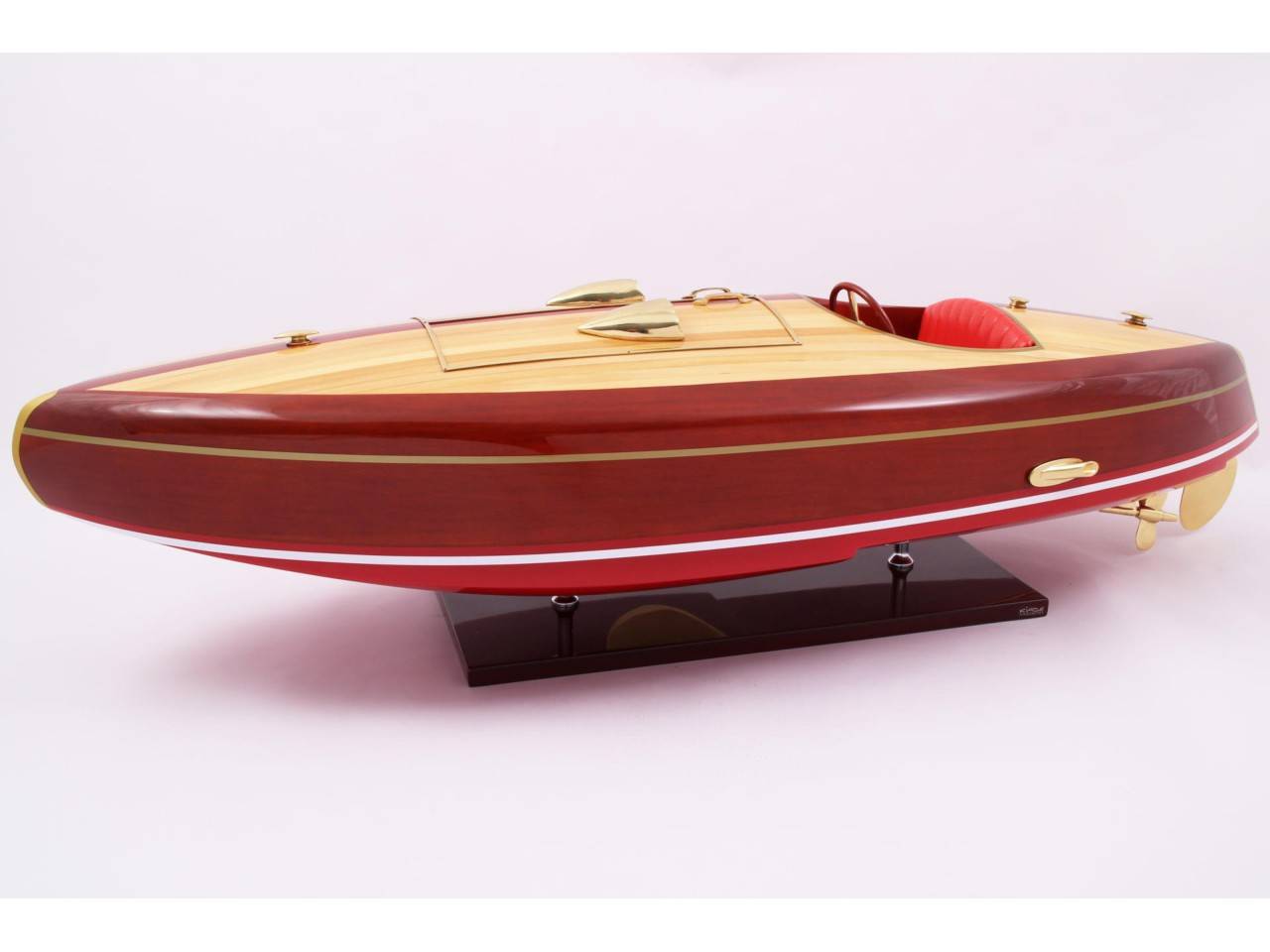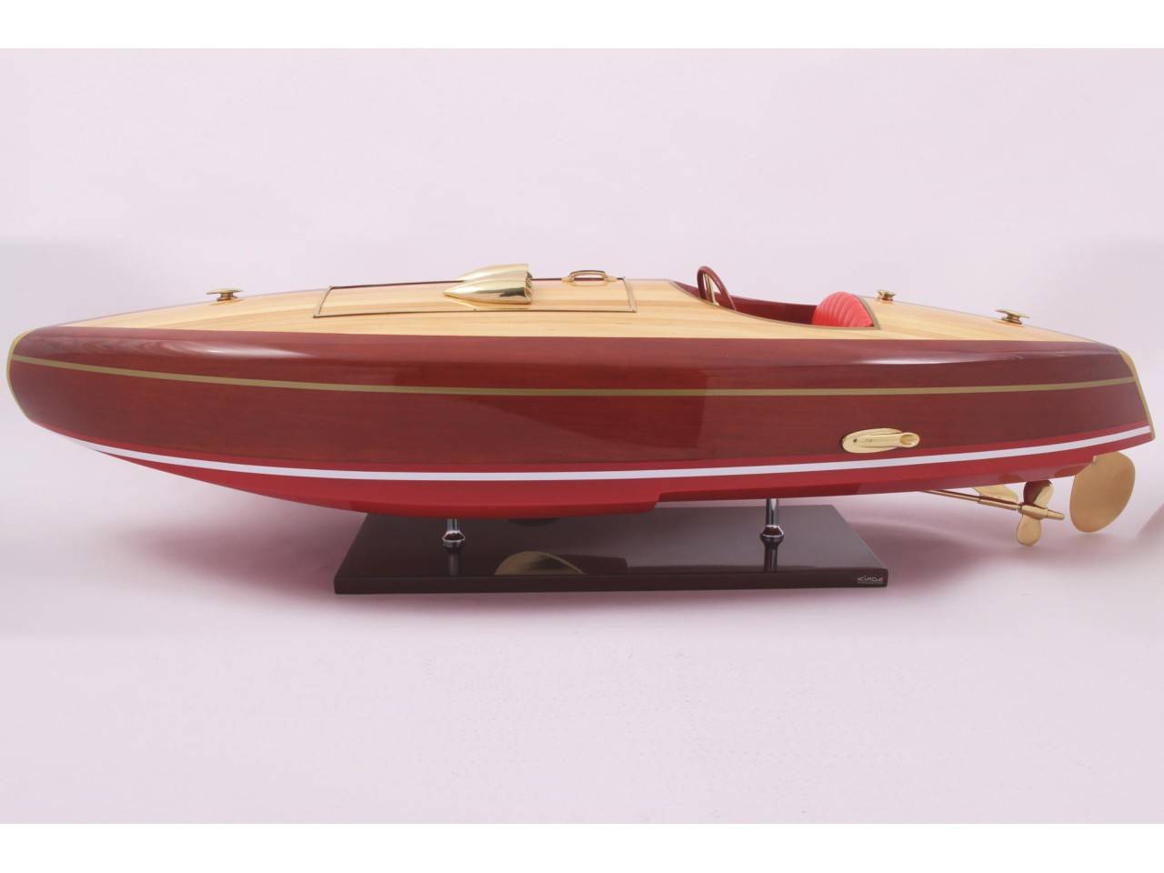 Véritable objet d’exception, cette maquette du FLYER d’une longueur de 82 cm a est très fidèle au modèle original. Celle-ci est entièrement réalisée à la main à partir de matériau noble : Bois véritable et sellerie marine. Toutes les pièces d’accastillage sont en laiton poli et verni, réalisées sur mesure par des bijoutiers. 10 couches de vernis sont appliquées pour obtenir une excellente brillance et profondeur de vernis.