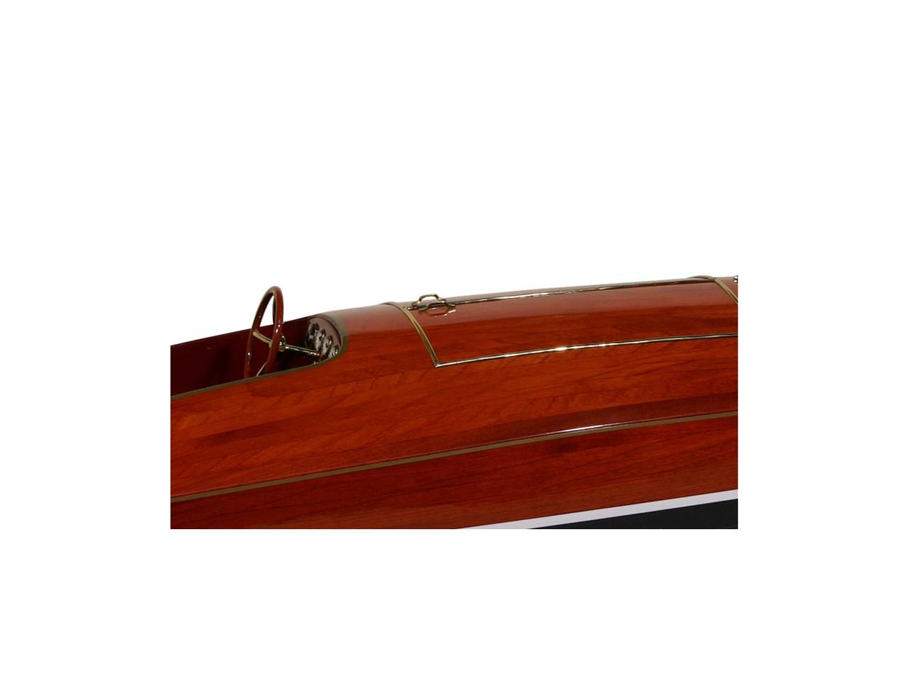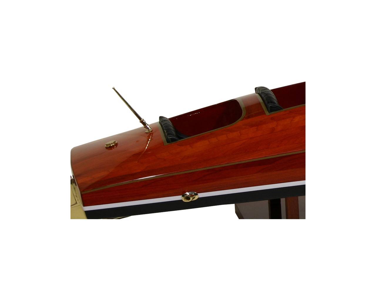 A true object of exception, this model of the Zipper is 90 cm long and has been made to a scale of 1/6th. A faithful replica of the famous "speed boat", this model is entirely handmade from noble materials: real wood and marine upholstery. All the fittings are made of chromed brass and are custom-made by jewelers. More than a thousand brass spikes are placed by hand on the hull. Finally, 10 coats of varnish are applied to obtain an excellent shine and depth of varnish.