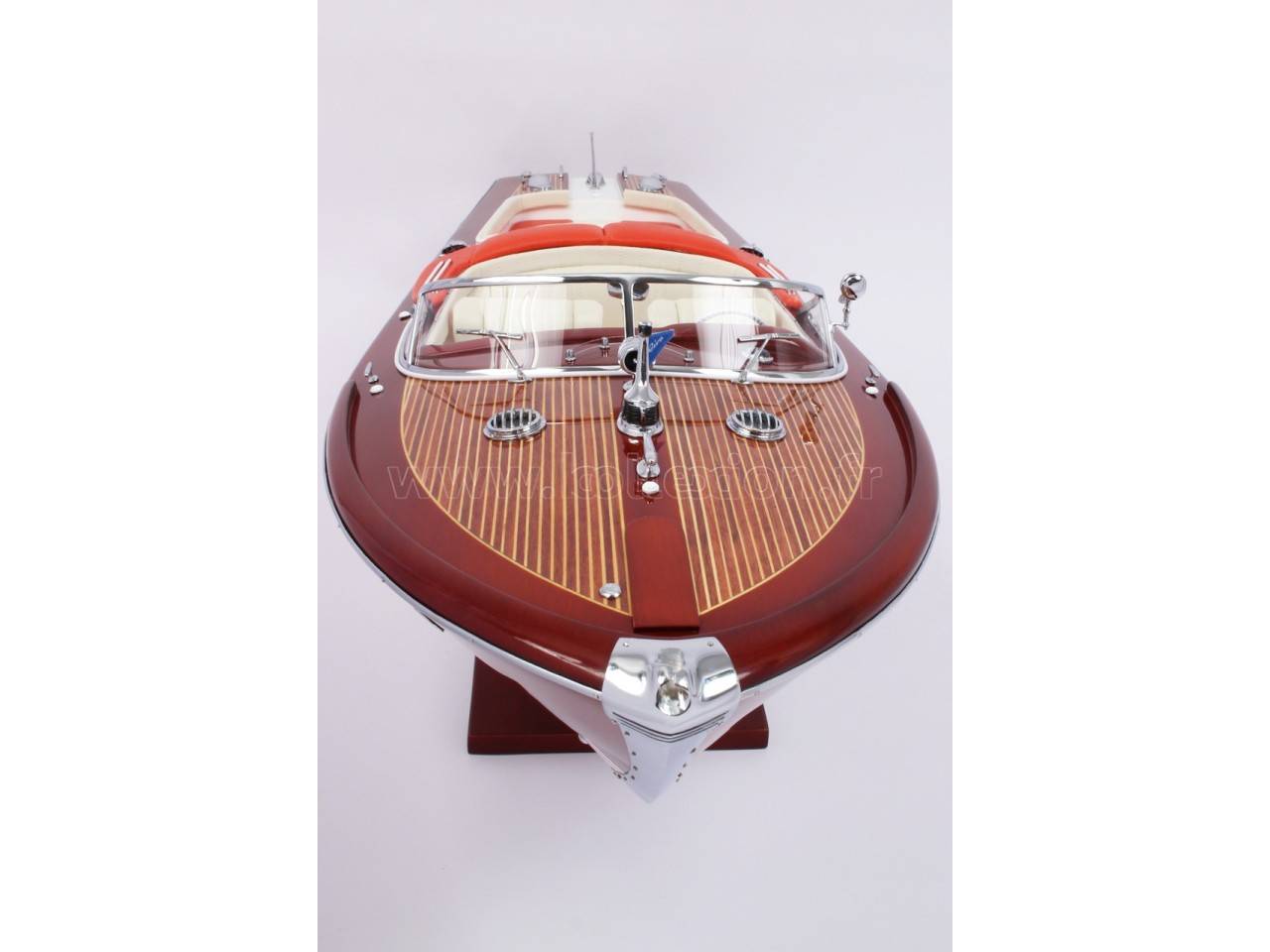This official model boat “RIVA AQUARAMA SPECIAL” is built in mahogany exactly as the real boat with fitting parts ( chrom brass) built by our jewellers. Real upholstery.
