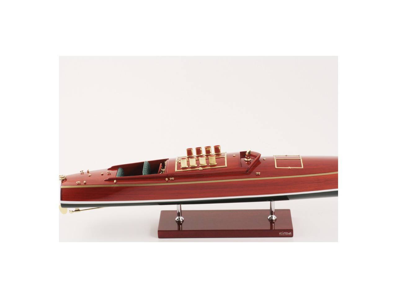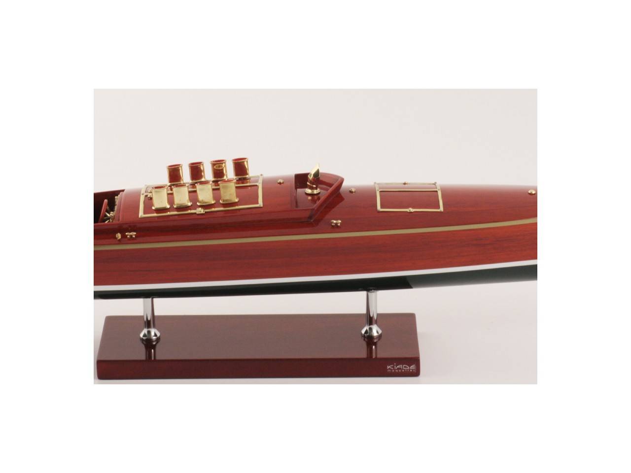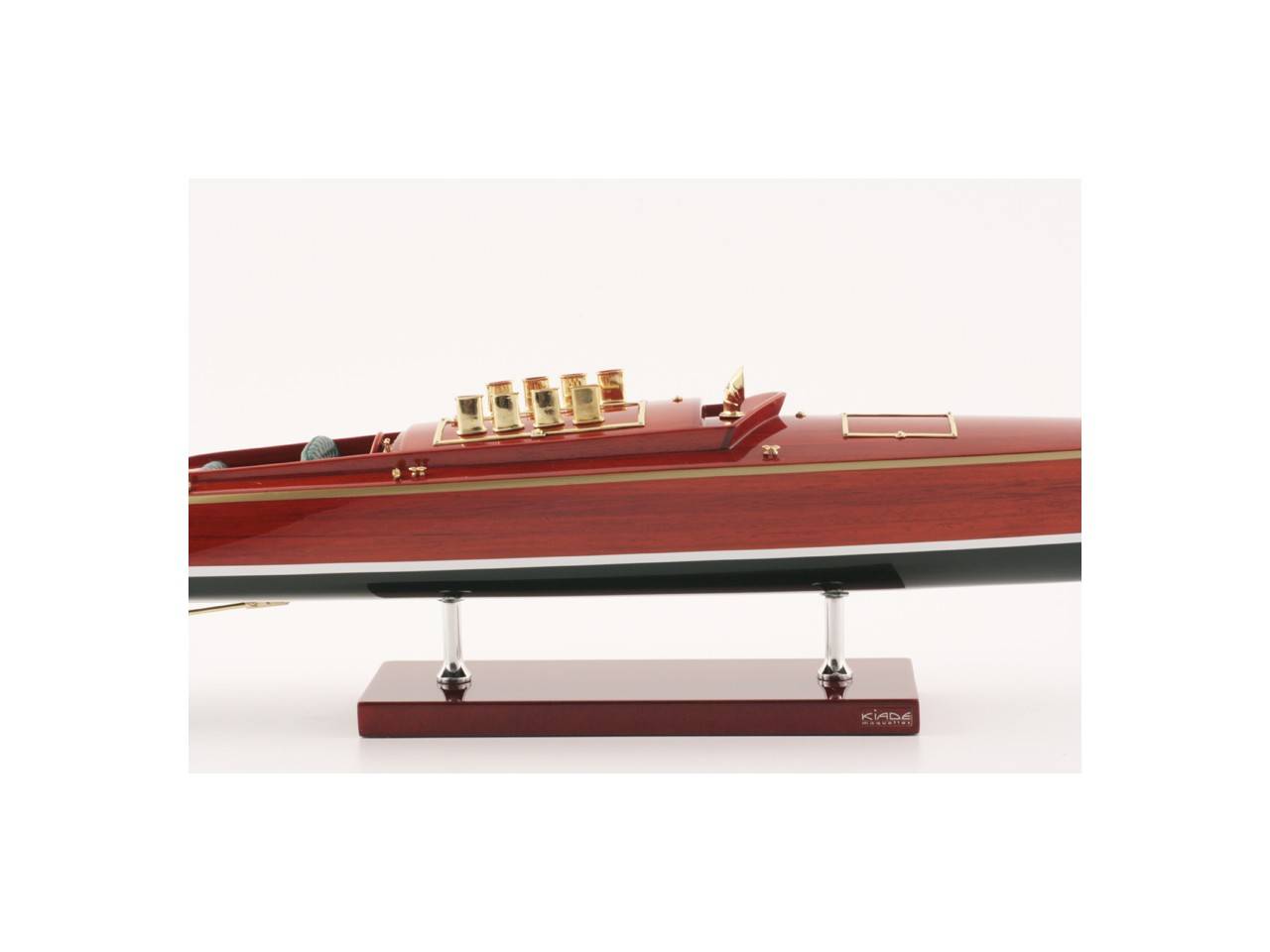 True object of exception, this model of a length of 91 cm has is very faithful to the original model. This model is entirely handmade from noble materials: real wood and marine upholstery. All the fittings are in polished and varnished brass, made to measure by jewelers. 10 layers of varnish are applied to obtain an excellent shine and depth of varnish.