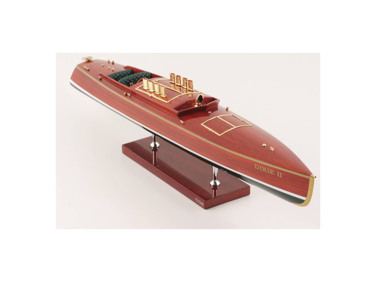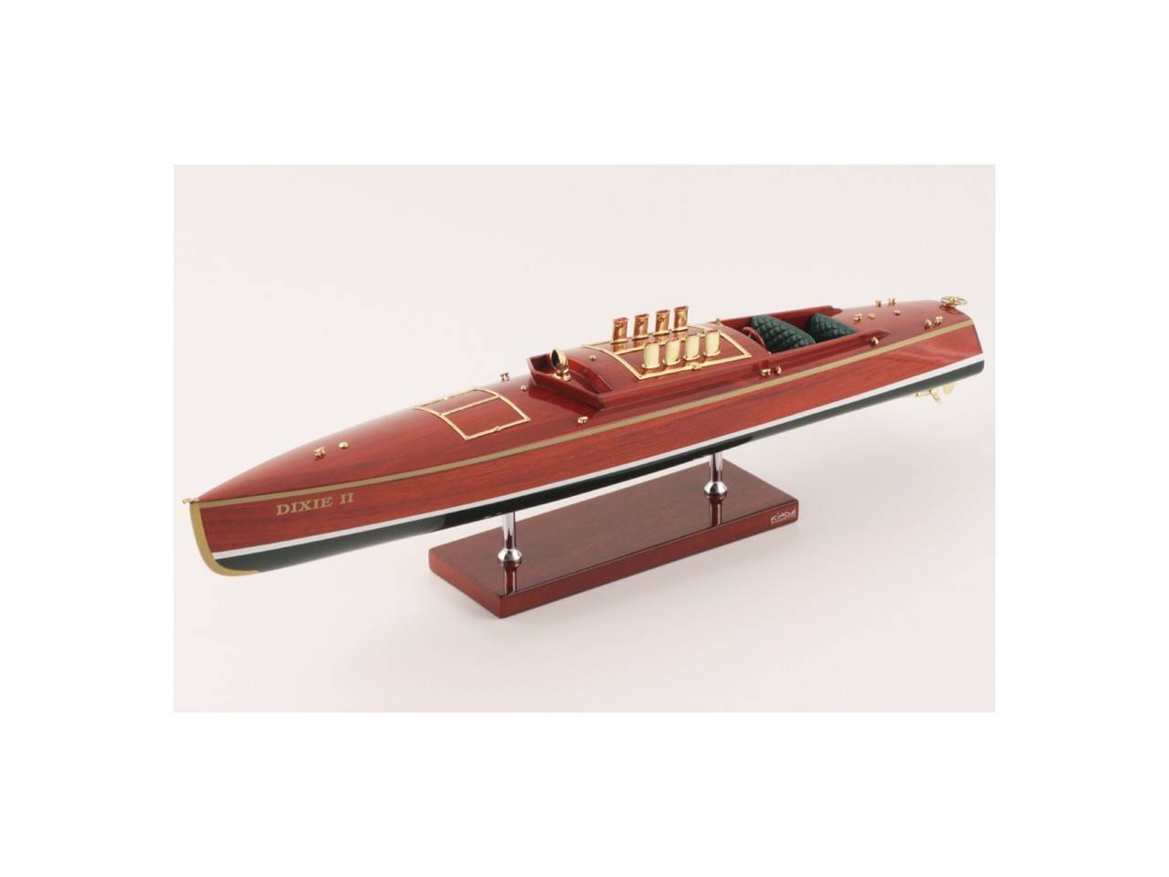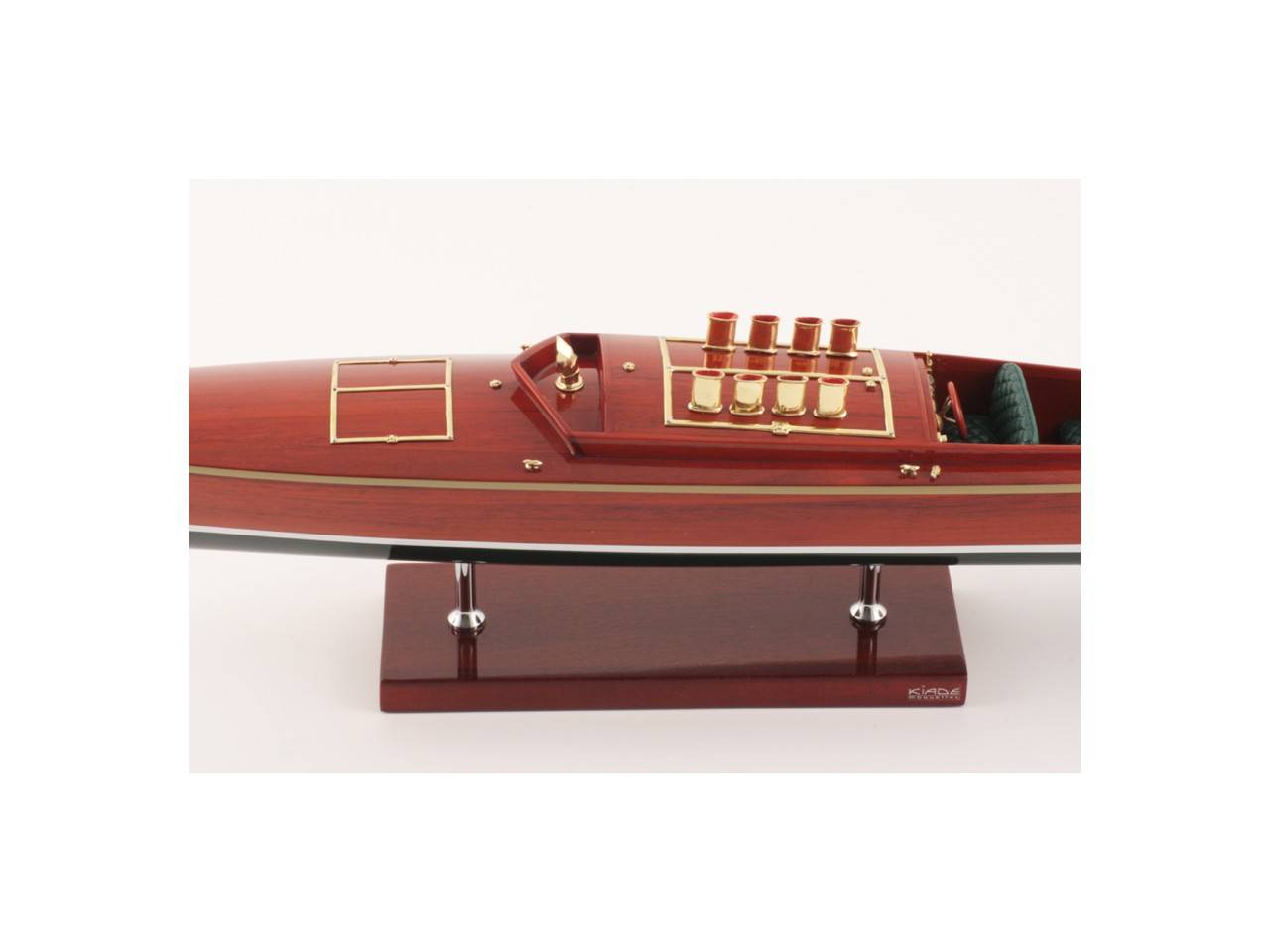 True object of exception, this model of a length of 91 cm has is very faithful to the original model. This model is entirely handmade from noble materials: real wood and marine upholstery. All the fittings are in polished and varnished brass, made to measure by jewelers. 10 layers of varnish are applied to obtain an excellent shine and depth of varnish.