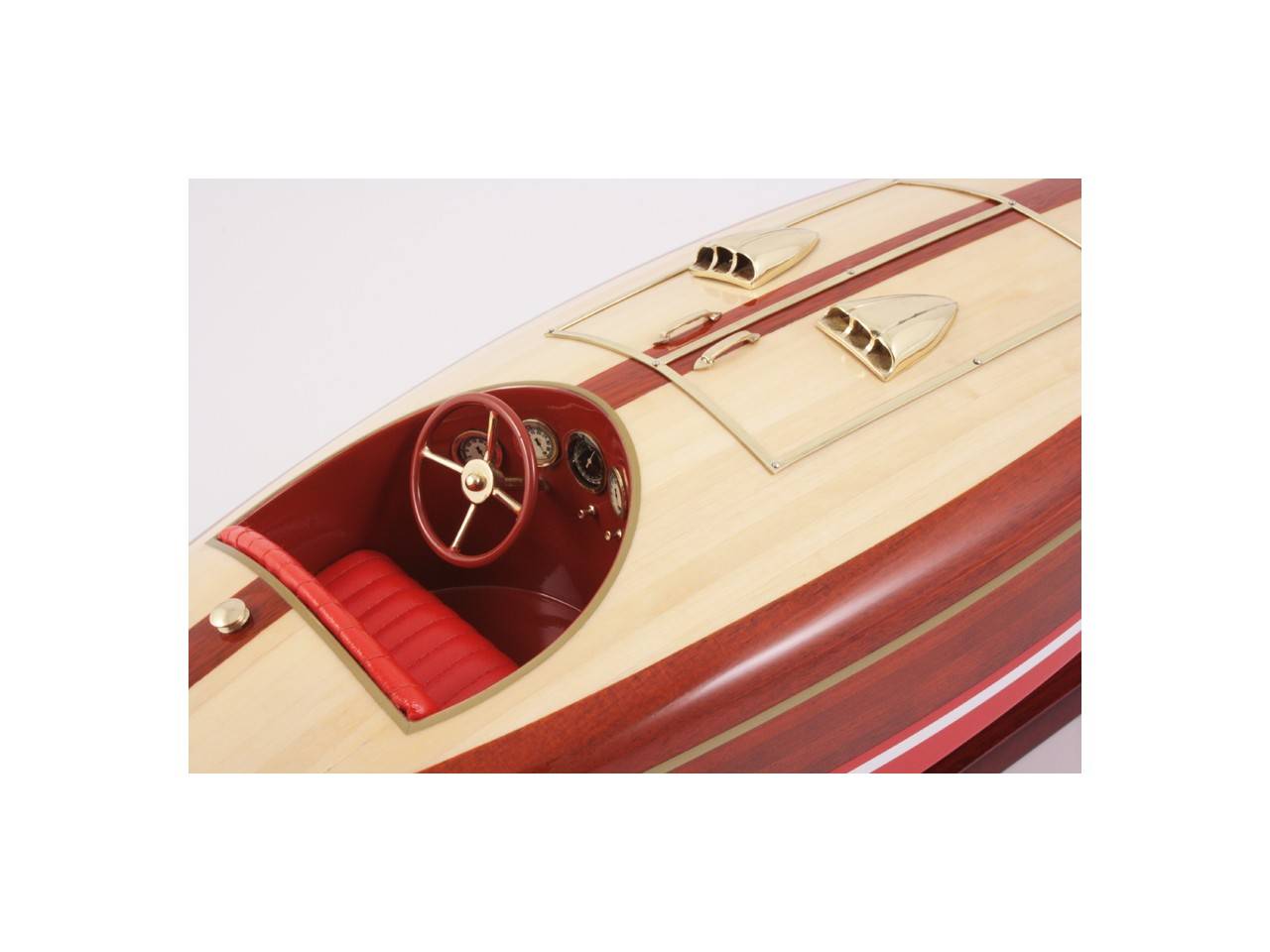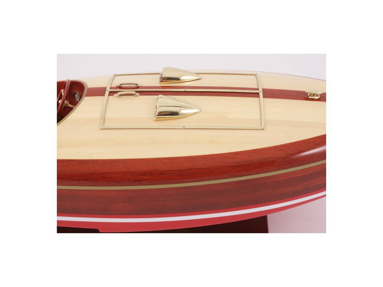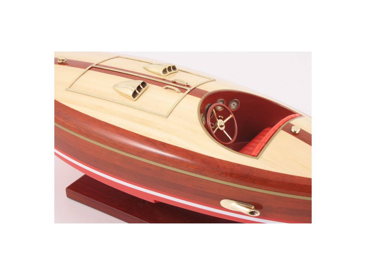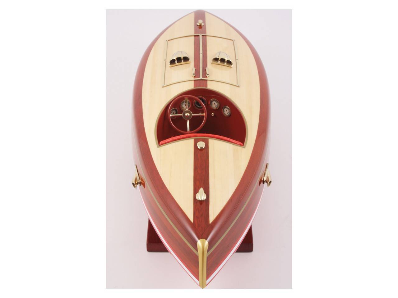 This 50 cm long model of the FLYER is very faithful to the original model. It is entirely handmade from noble materials: real wood and marine saddlery. All the fittings are made of polished and varnished brass, made to measure by jewelers. 8 layers of varnish are applied to obtain an excellent shine and depth of varnish.