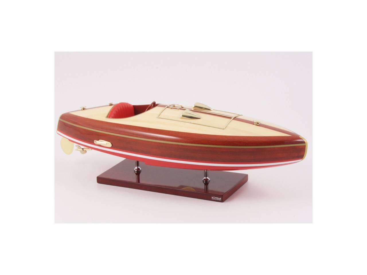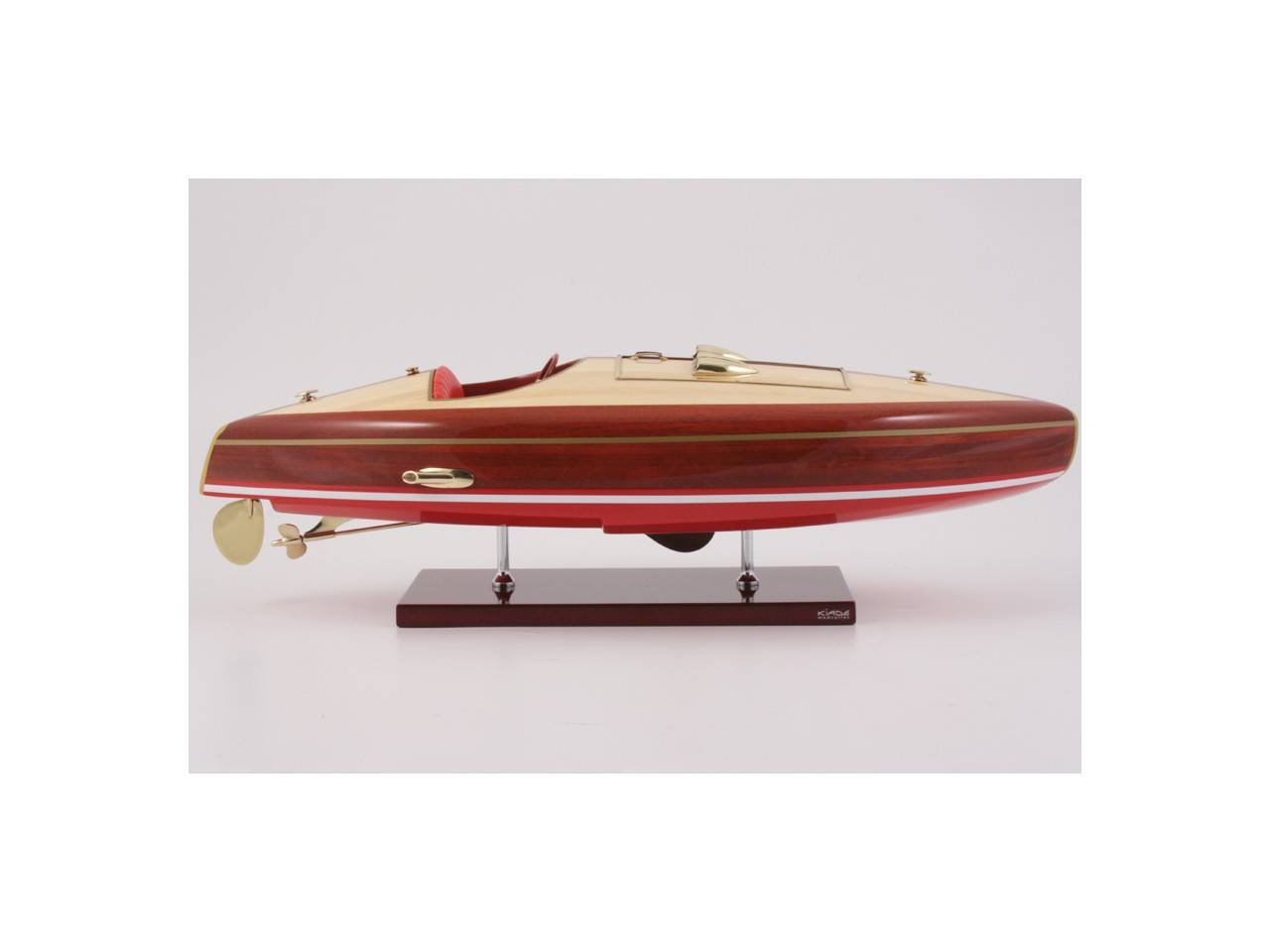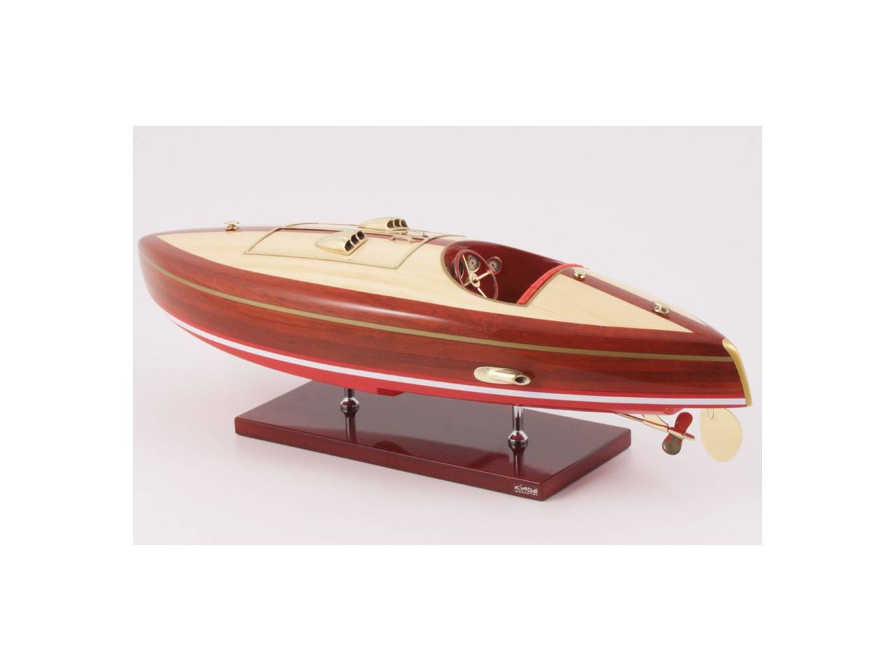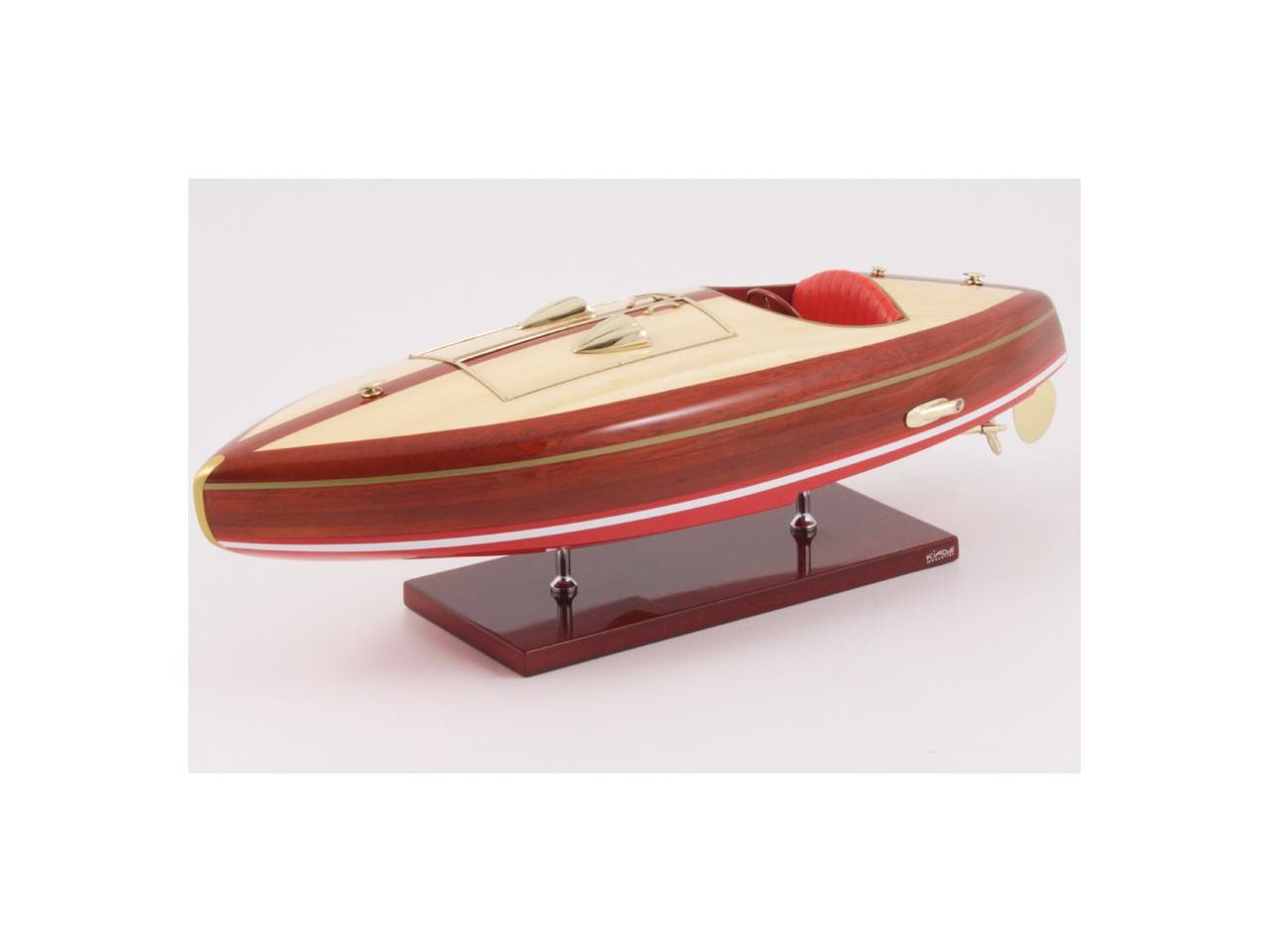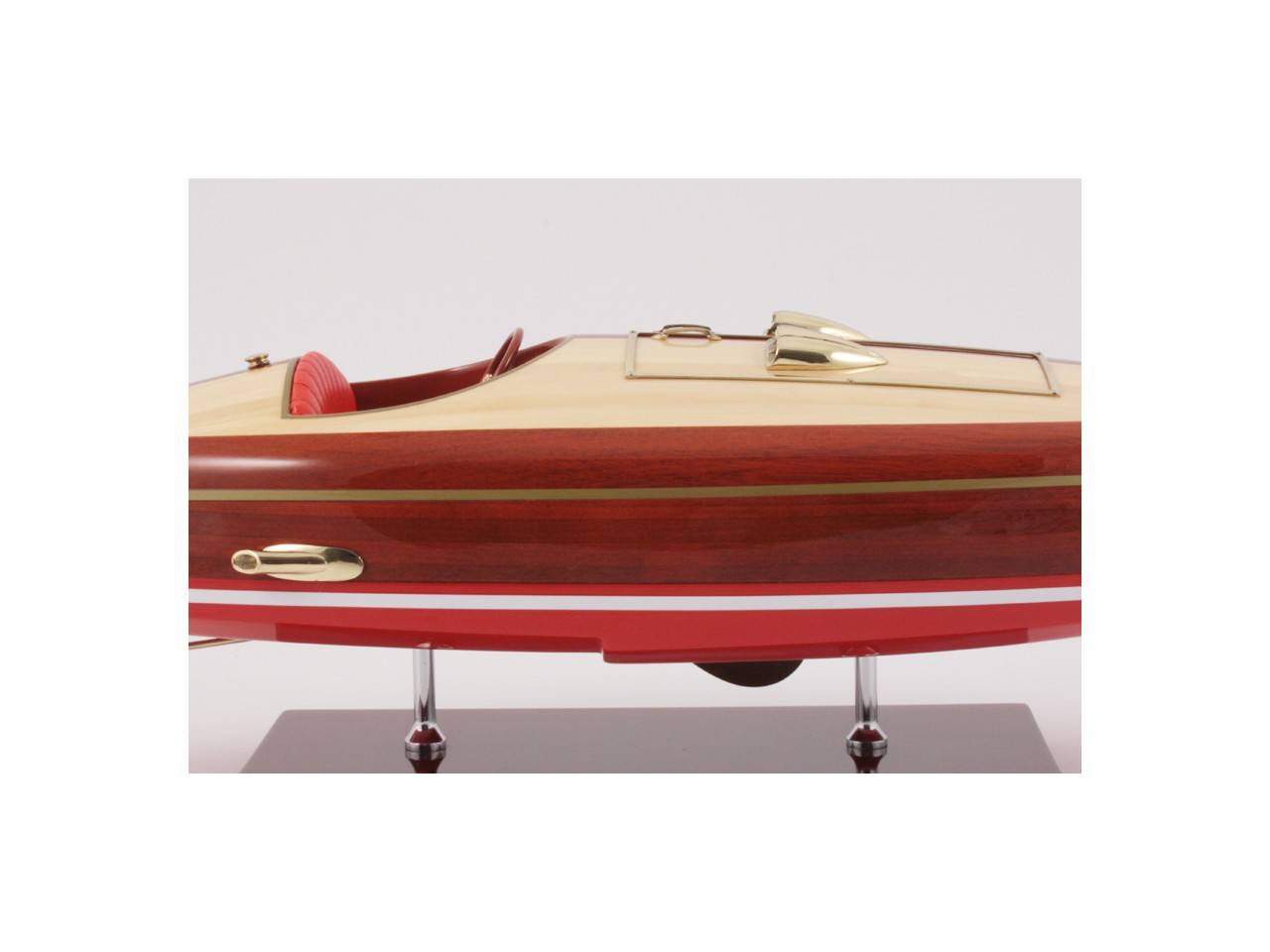 This 50 cm long model of the FLYER is very faithful to the original model. It is entirely handmade from noble materials: real wood and marine saddlery. All the fittings are made of polished and varnished brass, made to measure by jewelers. 8 layers of varnish are applied to obtain an excellent shine and depth of varnish.